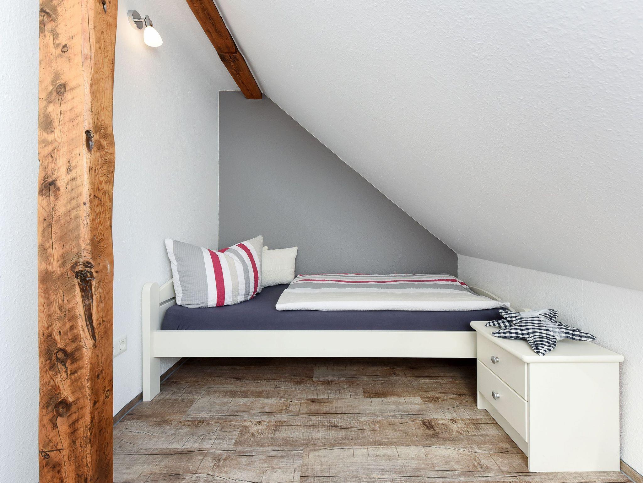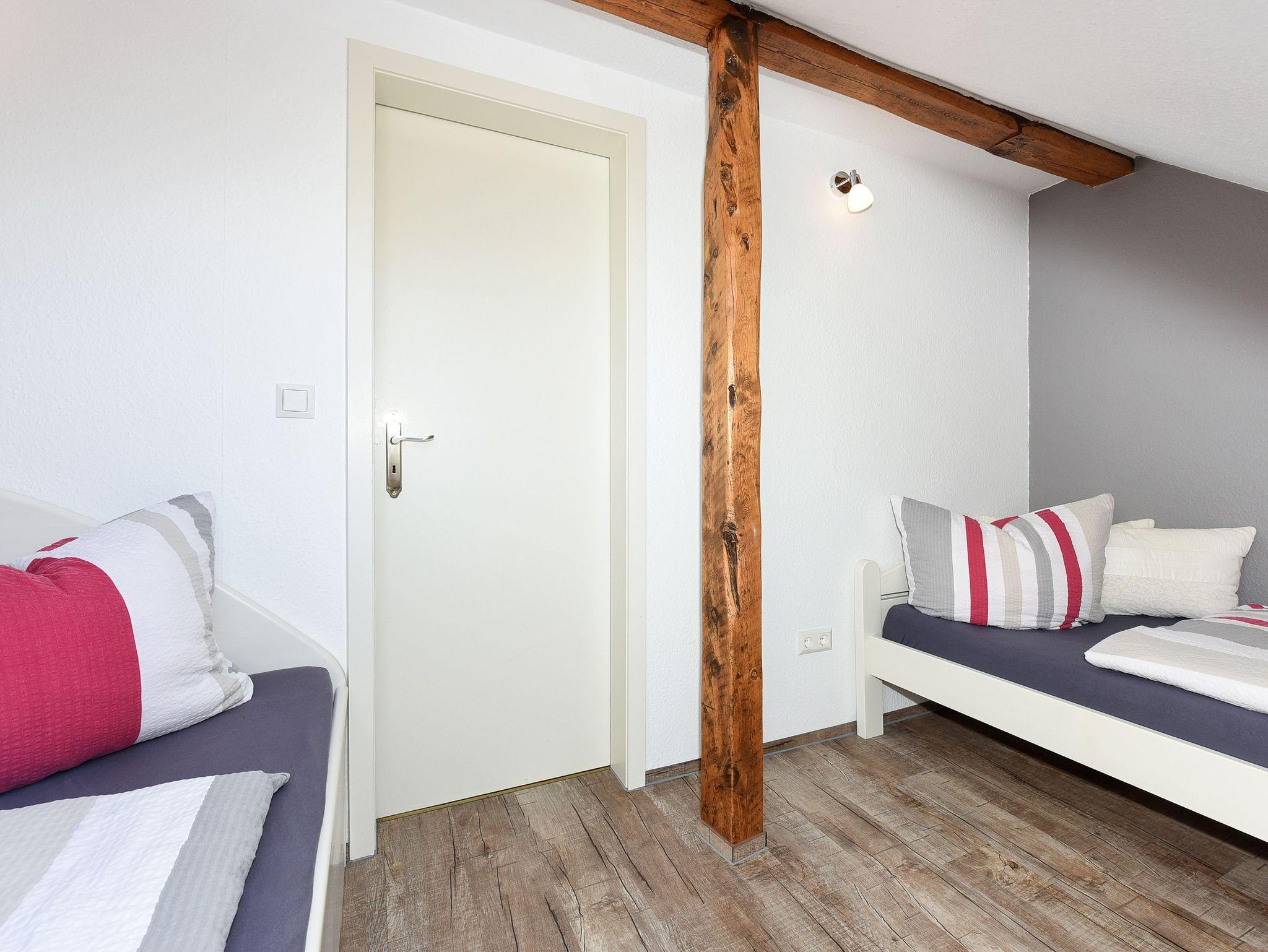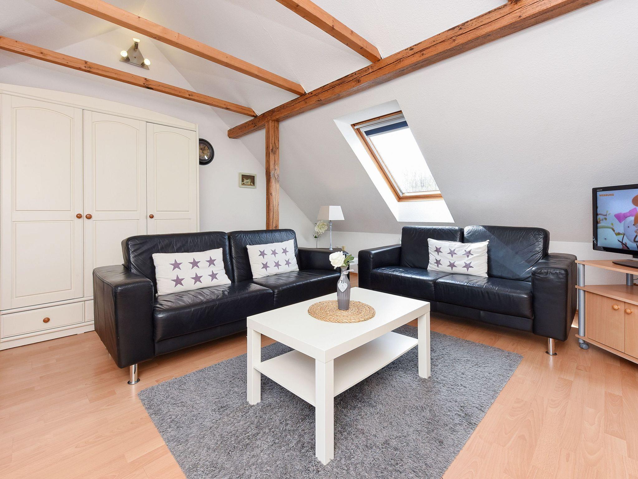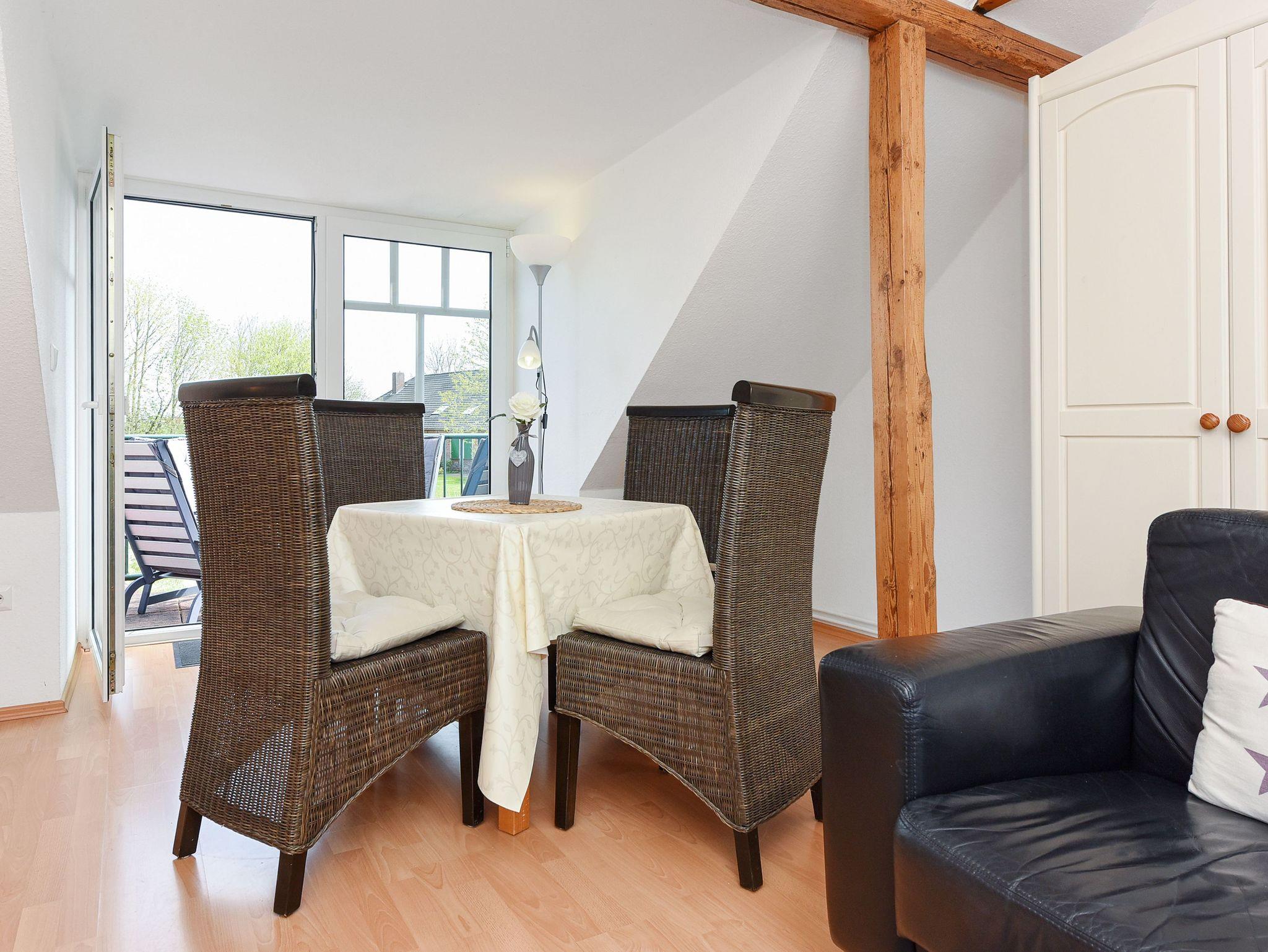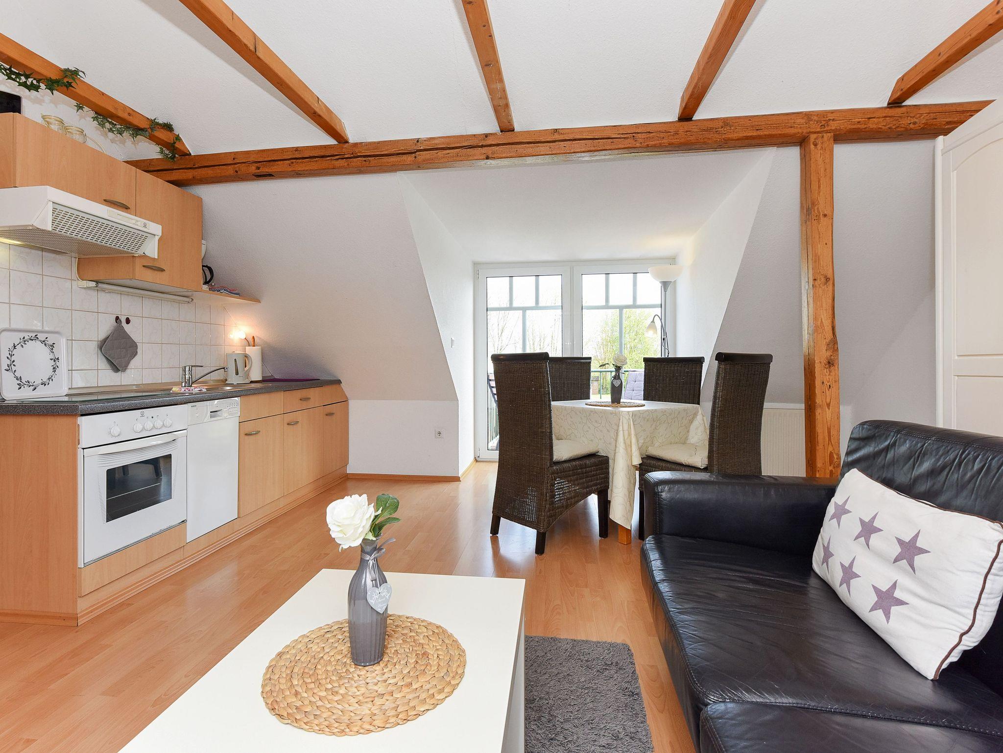 Größe ca. 60 Quadratmeter, Wohnraum mit integrierter Küche, Schlafzimmer, zweites separates Schlafzimmer/Kinderzimmer, Badezimmer mit Dusche, Waschtisch und WC, Obergeschoss, Gartennutzung, Waschmaschine, optimal für 2 bis 4 Personen und zusätzlich ein Kleinkind.