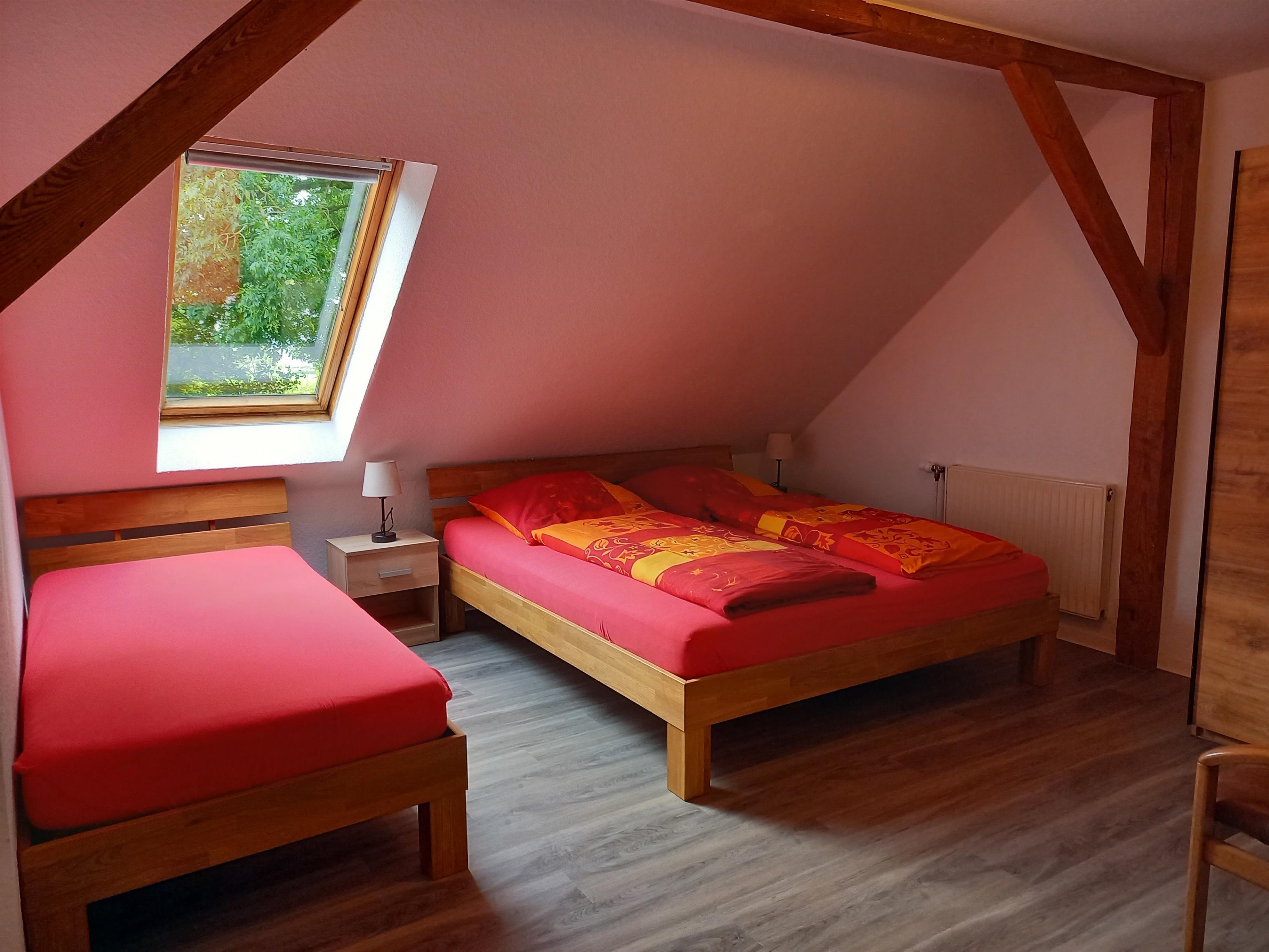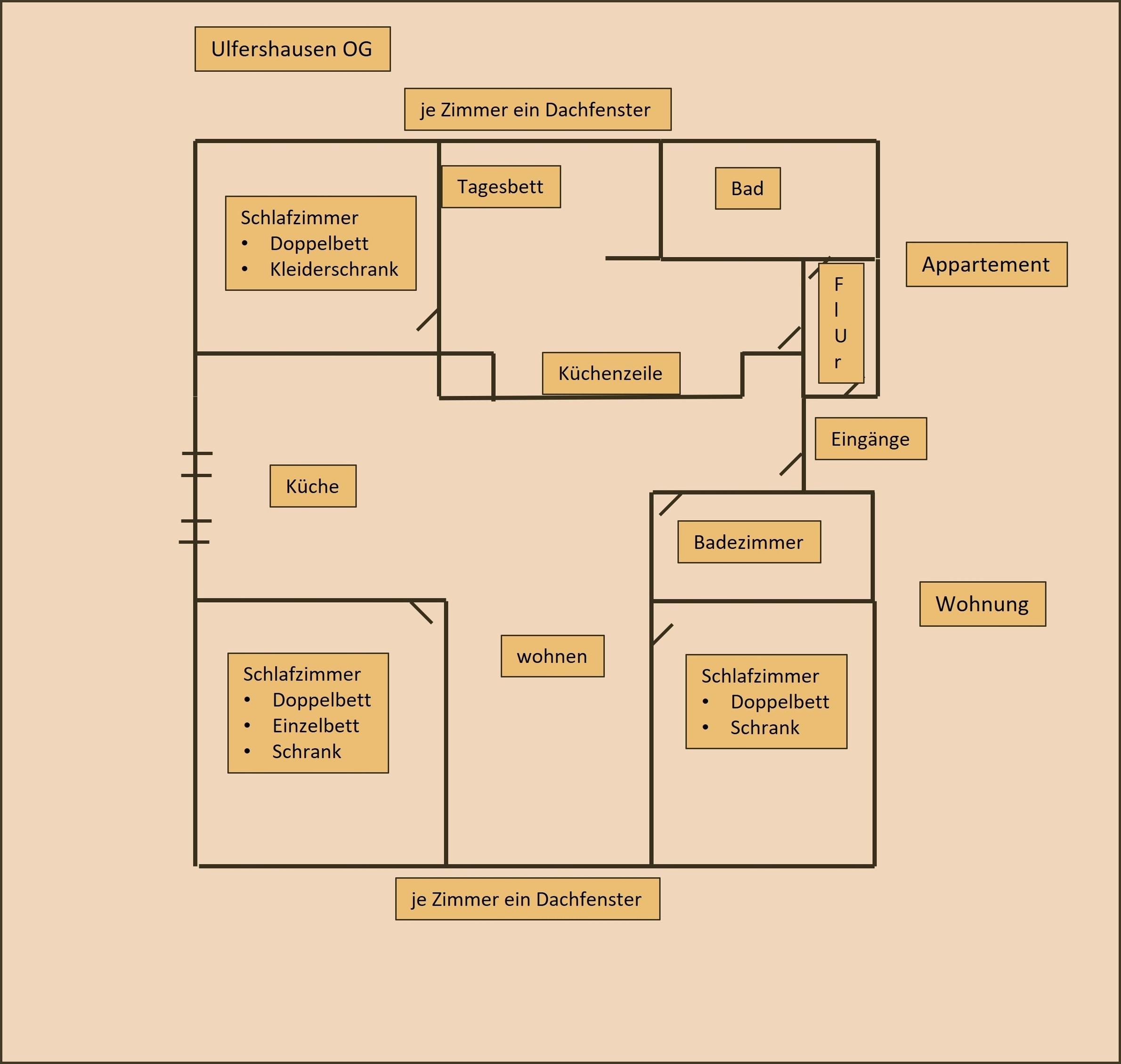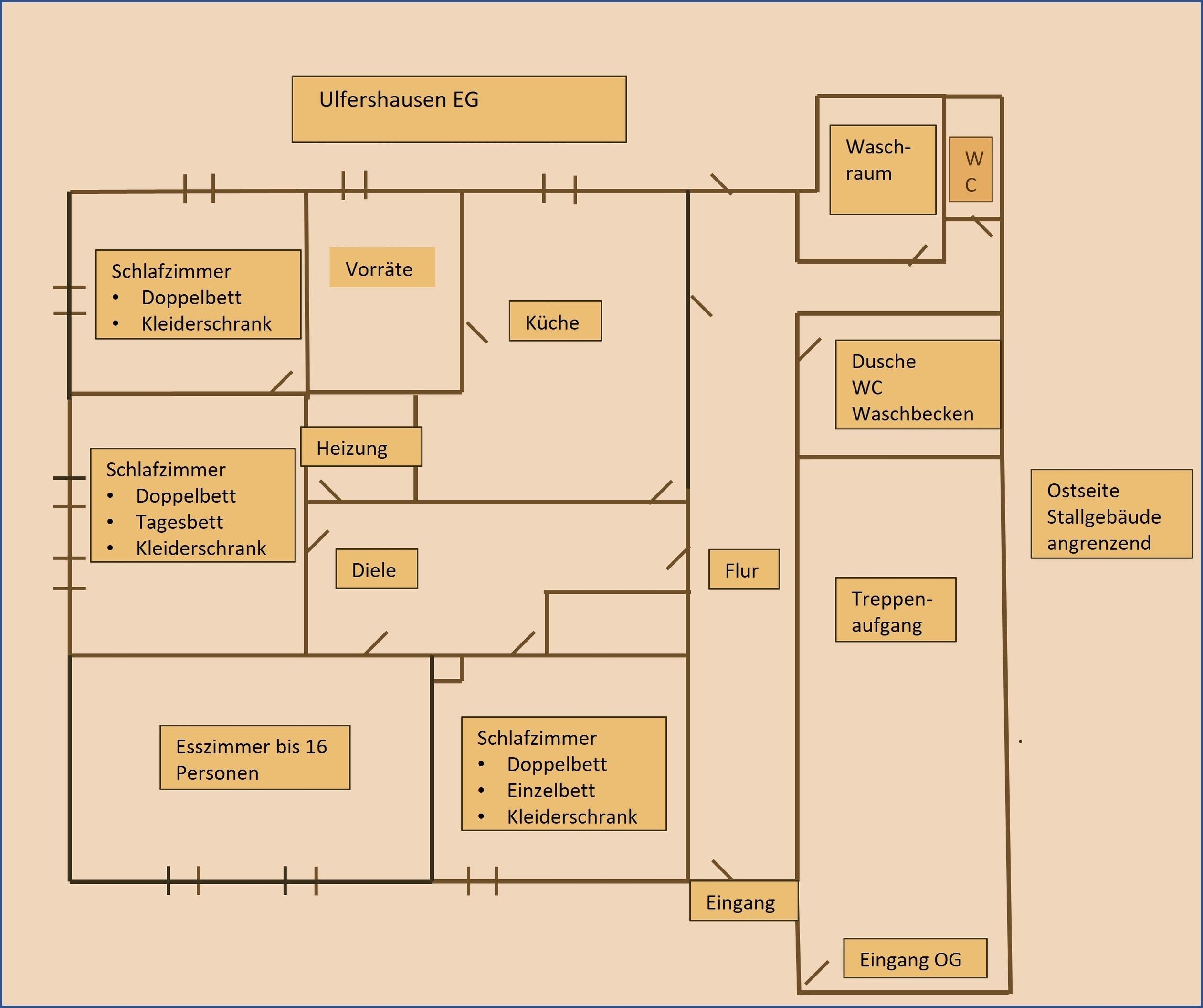 Das Bauernhaus ist im Gulfhausstiel erbaut worden und bietet daher großzügige Räumlichkeiten im EG mit hohen Decken und großen Fenstern. Im EG stehen Ihnen drei Schlafzimmer, ein Esszimmer, eine Küche mit Vorratsraum auf insgesamt 140 qm zur Verfügung. Das OG hat einen separaten Eingang. Dort gibt es in zwei weiteren Wohneinheiten insgesamt noch vier Schlafzimmer und einen großzügigen Wohn- und Essbereich. Im EG gibt es ein geräumiges Badezimmer mit zwei Waschbecken, einer ebenerdigen Dusche und einem WC, sowie einen Waschraum mit Waschmaschine, Waschbecken und Badewanne und ein separates Gäste WC. Die Wohnung im OG verfügt über ein Badezimmer mit Dusche, Badewanne, Waschbecken und WC. Das Appartement im OG ist mit einem Badezimmer mit Dusche, Waschbecken und WC ausgestattet.