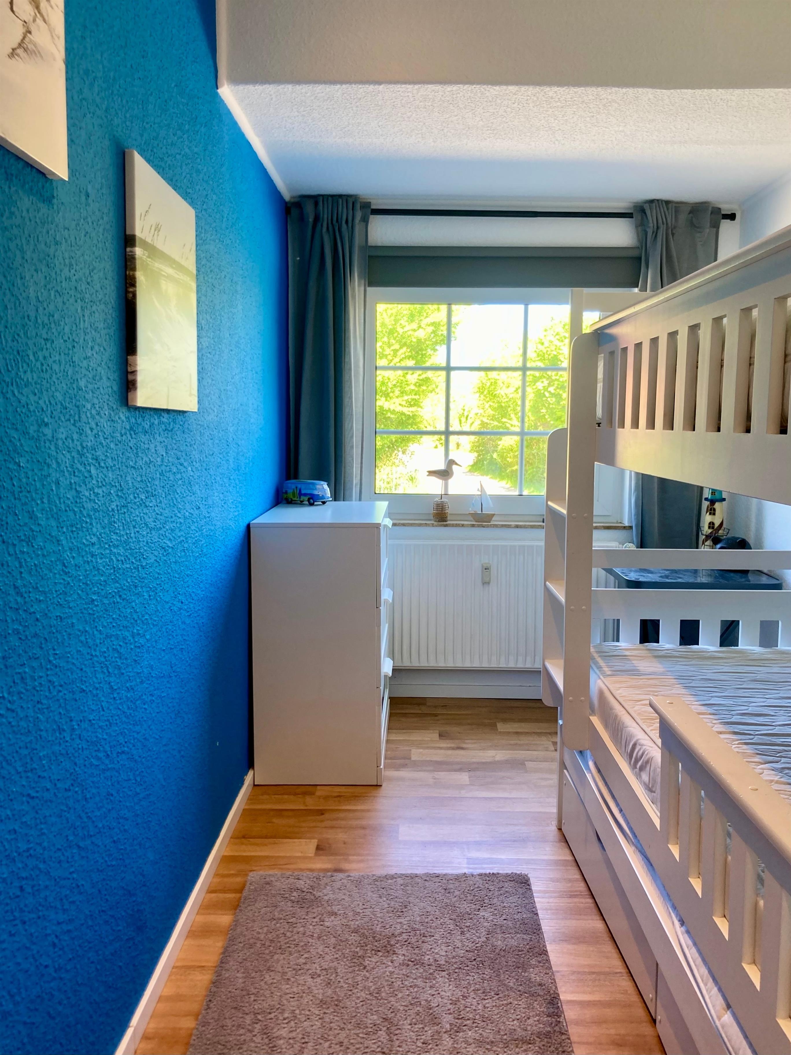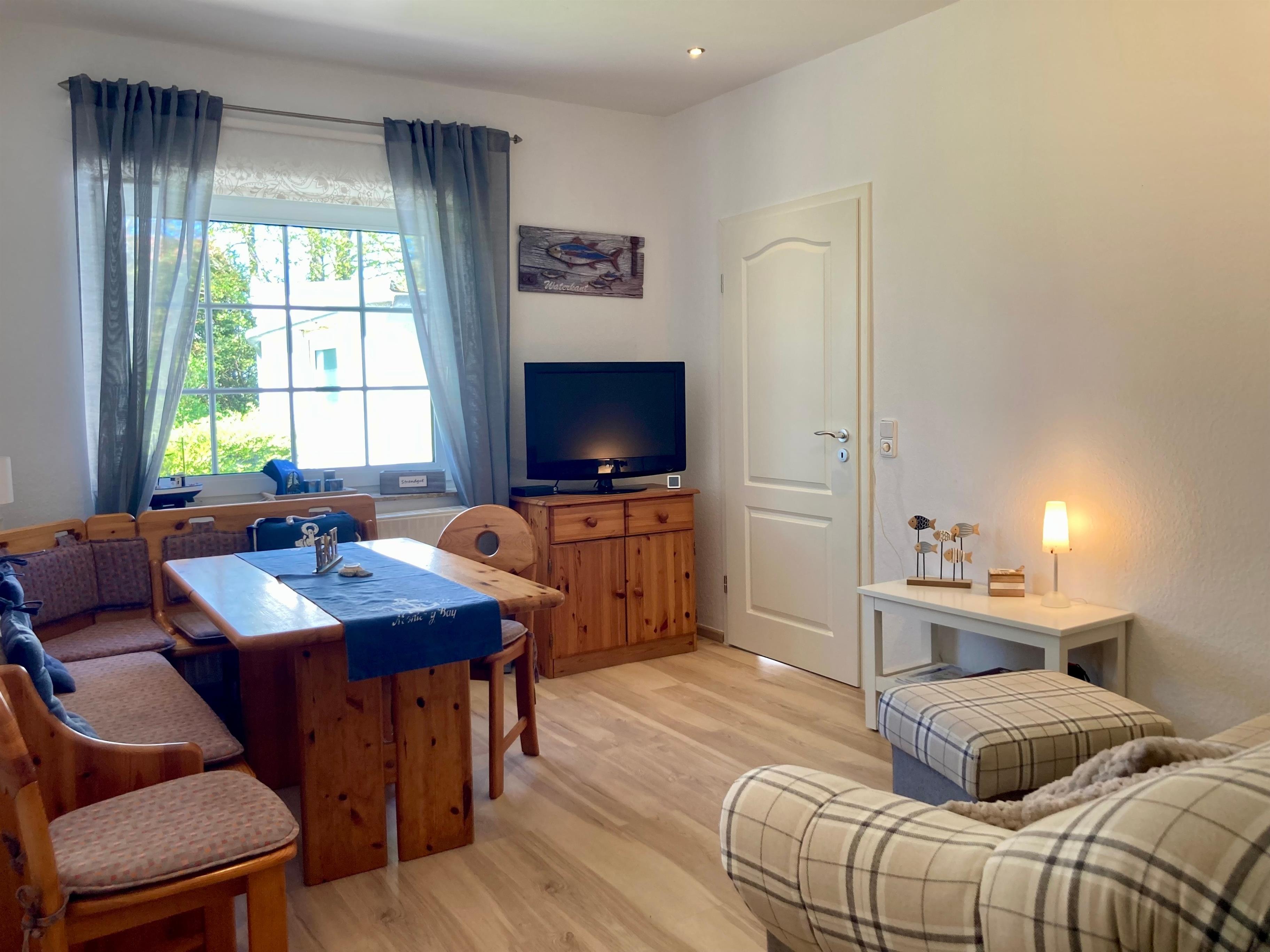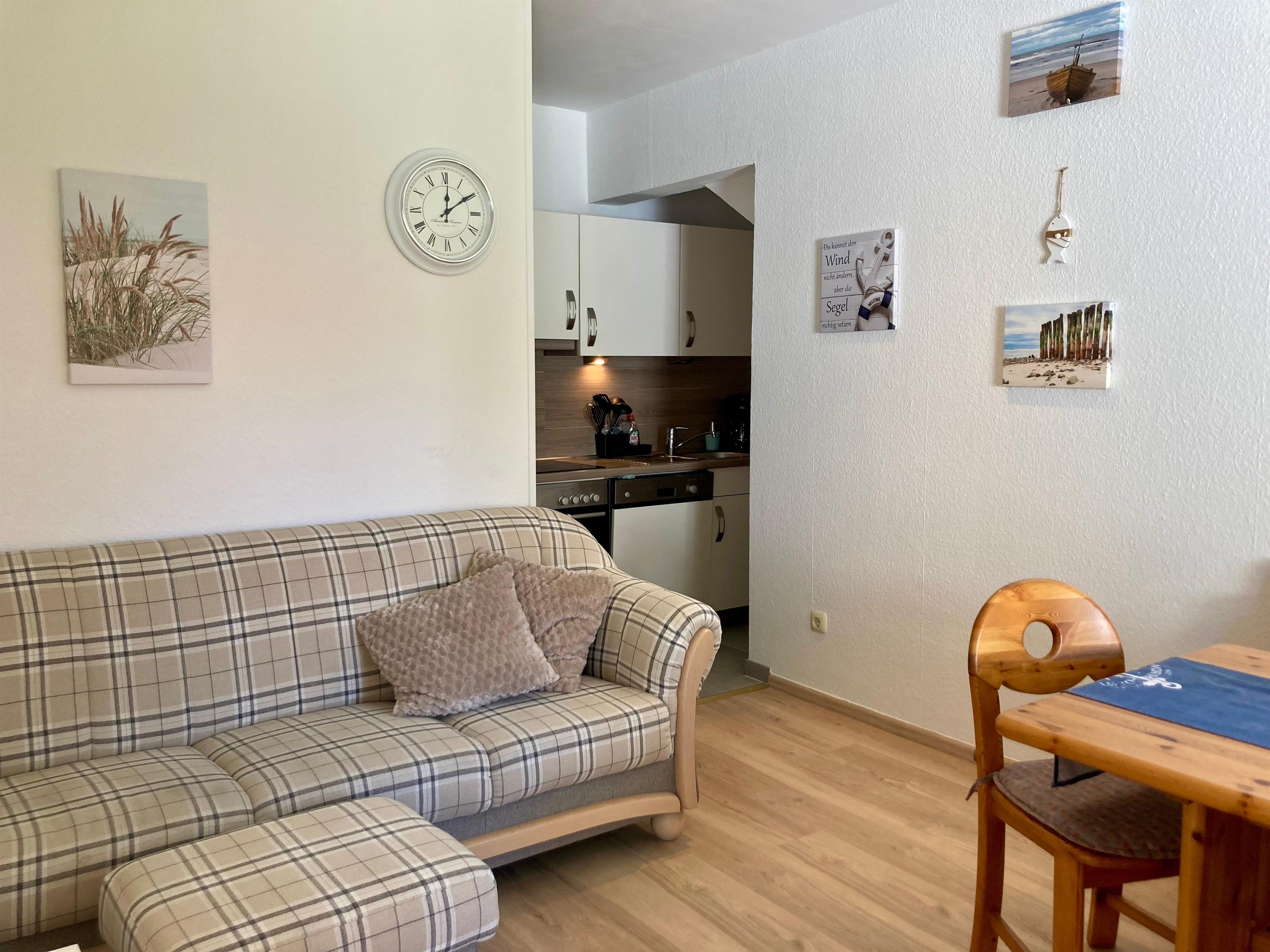 Freundlich-helle, gemütliche Einrichtung und gute Ausstattung, Auswahl an Deko-Elementen mit maritimem Touch, Vinylfußböden. Kleine Auswahl an Kinderbüchern/-spielen. Pkw-Stellplatz am Haus oder in Hausnähe.