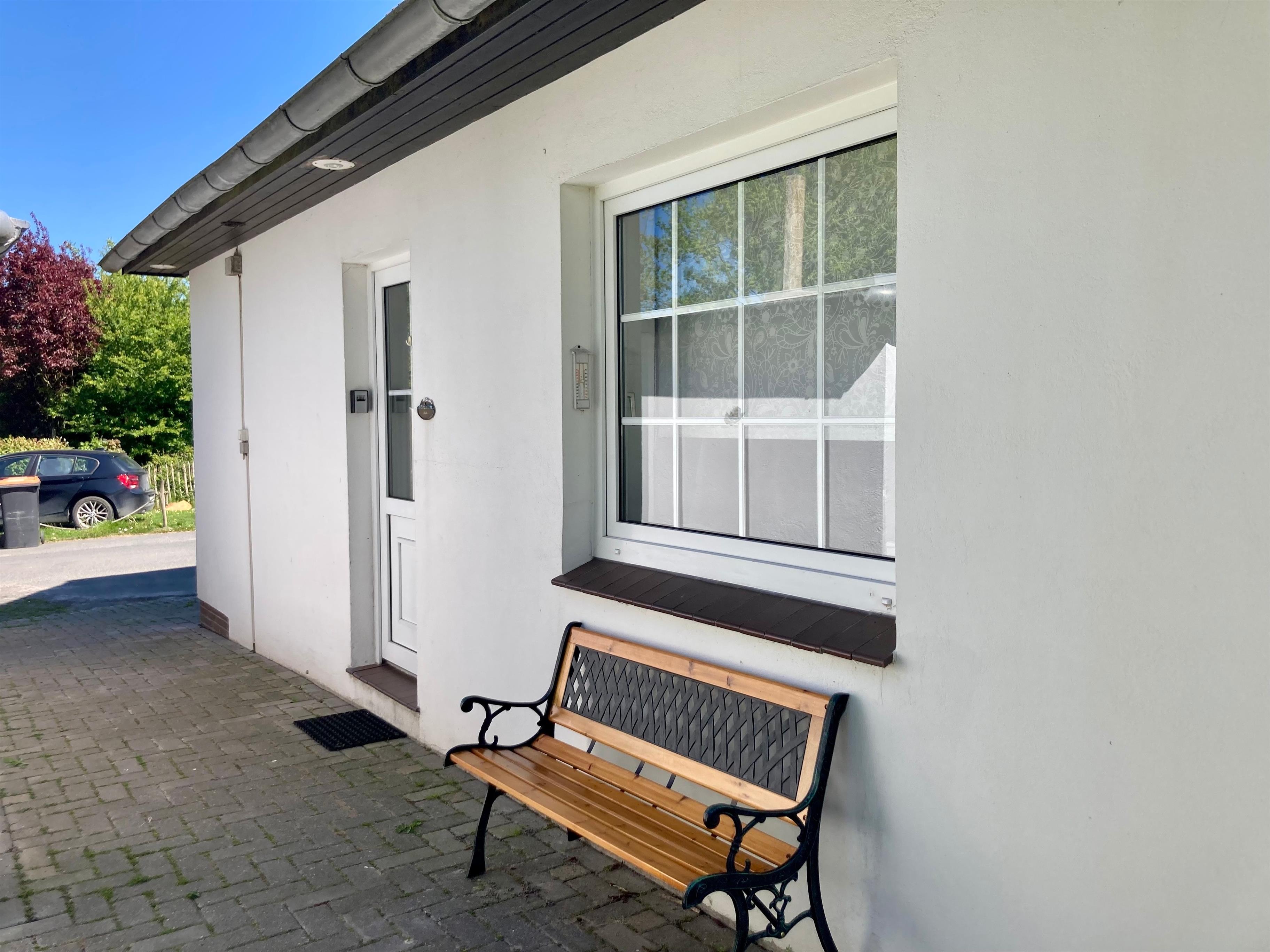 Am Haus Freisitz, Zugang zu kleinem Garten-/Rasenanteil mit altem Baumbestand sowie großer Terrasse mit Strandkorb, Tisch und 6 Stühlen zur gemeinsamen Nutzung. Eigener kleiner Tisch, 2 Stühle und 1 Liegestuhl (frei aufstellbar). Über Hecken und Büsche unverbauter Blick auf unmittelbar angrenzende Felder.
