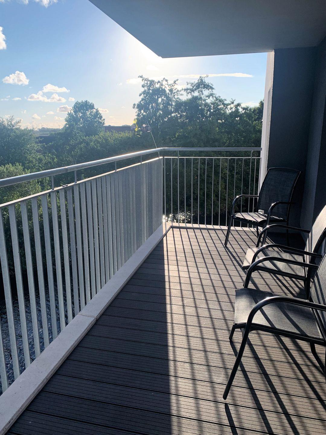 Ein großzügiger, möblierter und überdachter, nach Süden zum Wasserlauf ausgerichteter Balkon lädt zum Verweilen ein.