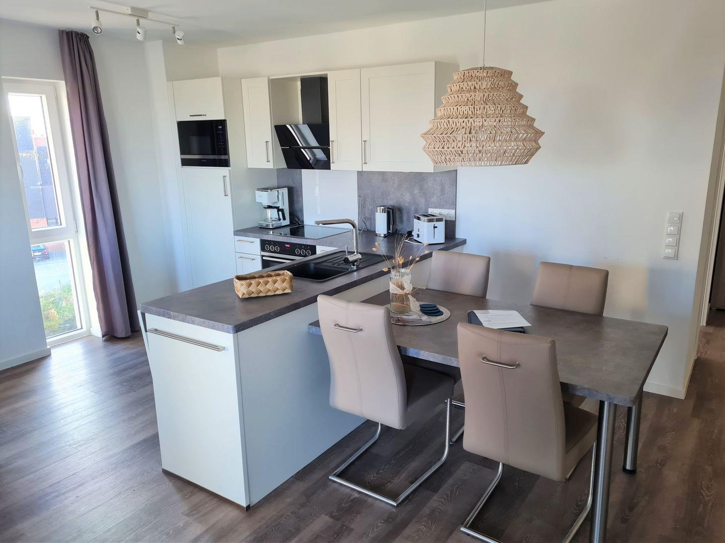 Ausgestattet mit einer gemütlichen Sofaecke besticht der Wohnbereich durch seine integrierte Küchenzeile, seinem großzügigen Essbereich mit Tisch und vier Stühlen.