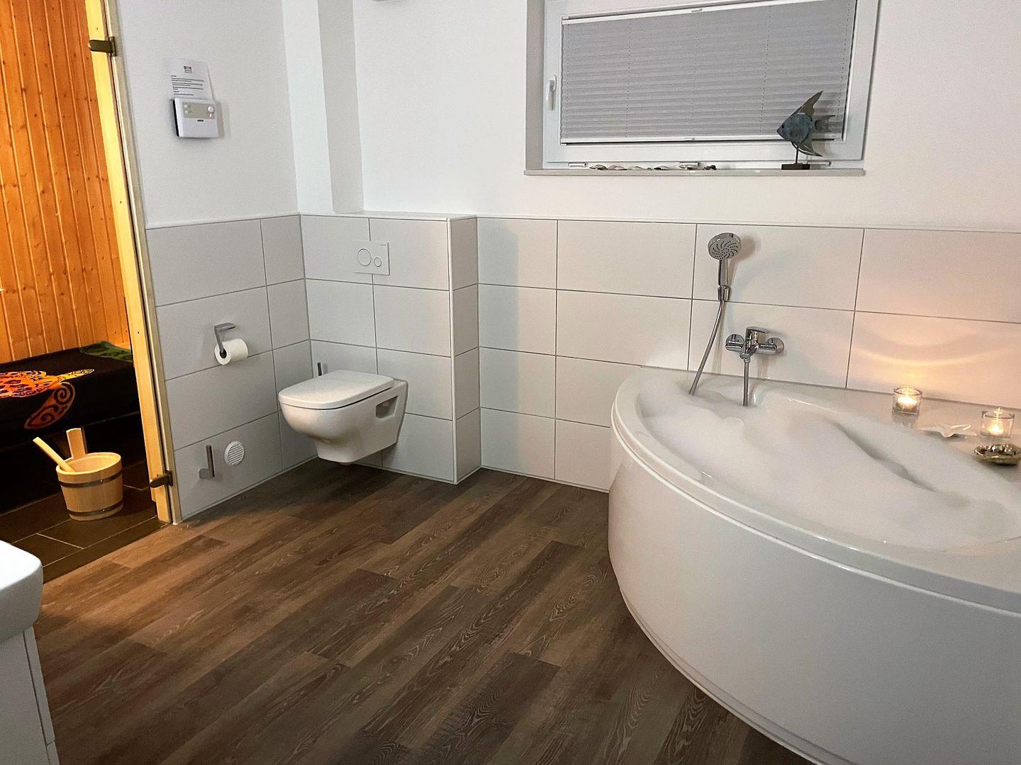 An stürmischen und/oder regnerischen Tagen kann das Badezimmer mit eigener Sauna und seiner Vollausstattung schnell zum Wellnesstempel werden. Hier bieten eine Sauna, eine Regendusche und eine Badewanne den nötigen Komfort zur Erholung. Saunadüfte für Ihre persönlichen Saunamomente können Sie an unserer Rezeption erwerben.