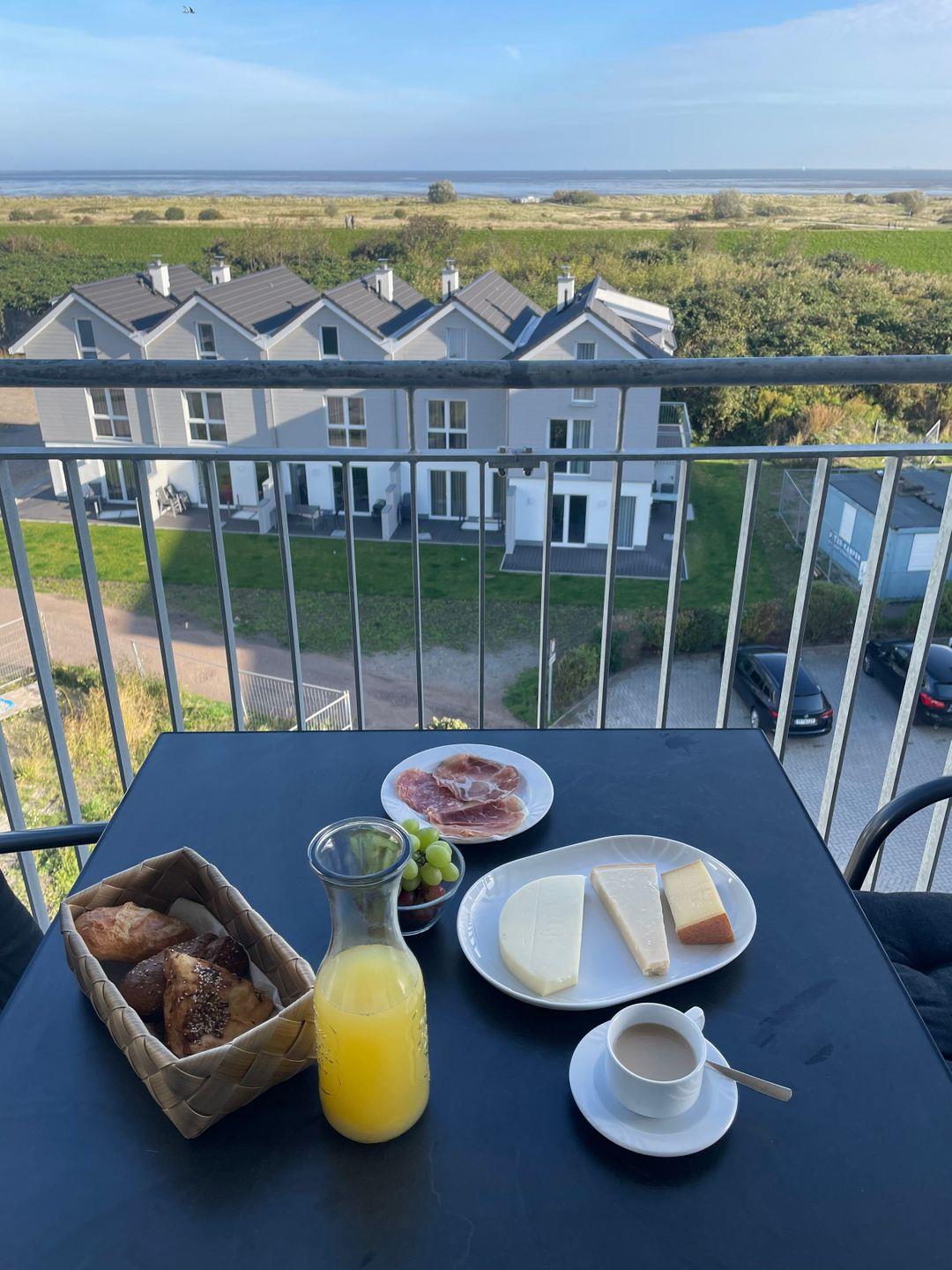 Ein großzügiger, möblierter und überdachter, nach Norden ausgerichteter Balkon bietet Ihnen einen wunderbaren Blick auf das Wattenmeer und lädt zum Verweilen ein.