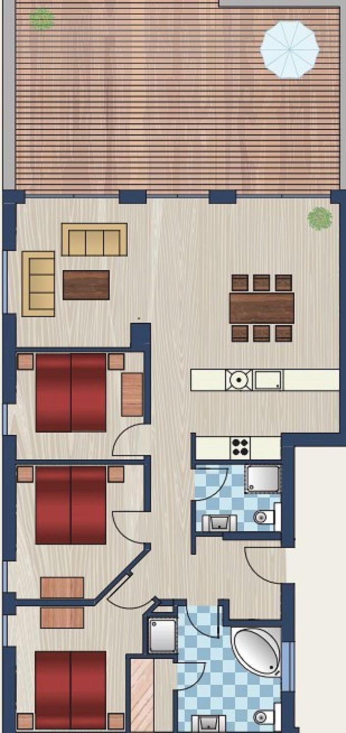 Drei Schlafzimmer, zwei Bäder und der großzügige Wohnraum als Mittelpunkt geben Ihrem Familienurlaub den richtigen Rahmen!