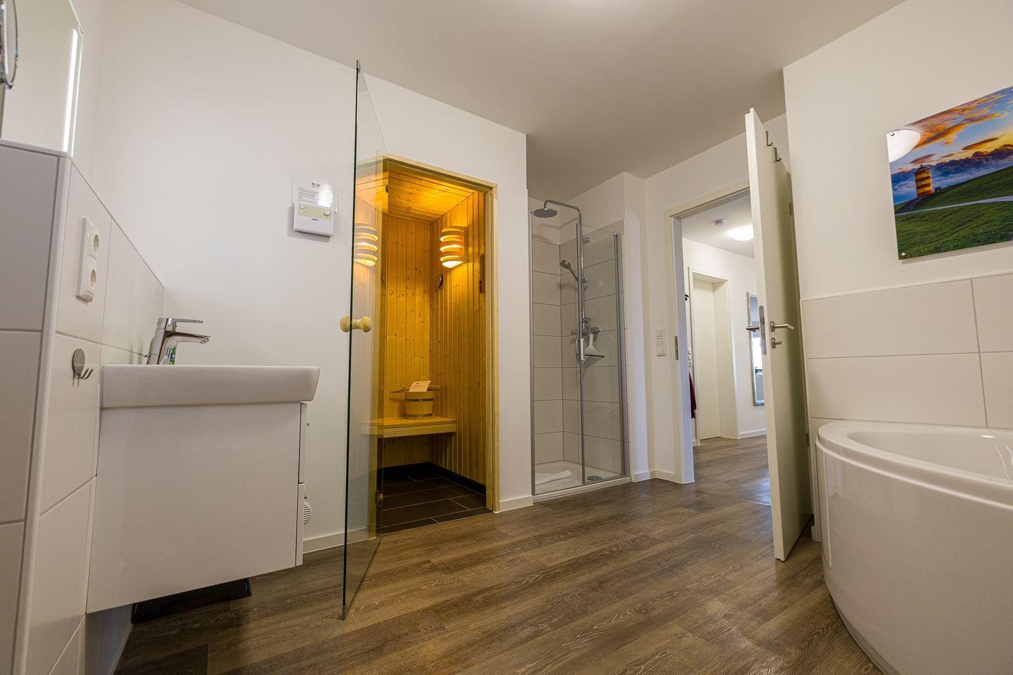 Das große Tageslicht Bad mit Sauna, verfügt über eine Regendusche und eine Badewanne und kann somit schnell zum Wellnesstempel werden! Saunadüfte für Ihre persönlichen Saunamomente können Sie an unserer Rezeption erwerben.