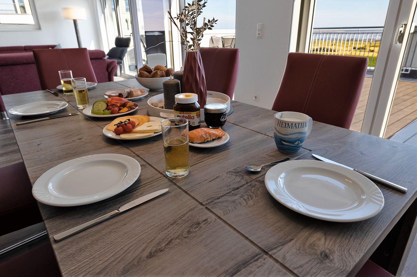 Vom großzügigen Esstisch aus, genießen Sie beim Speisen oder geselligen Beieinander einen herrlichen Ausblick auf das Wattenmeer!