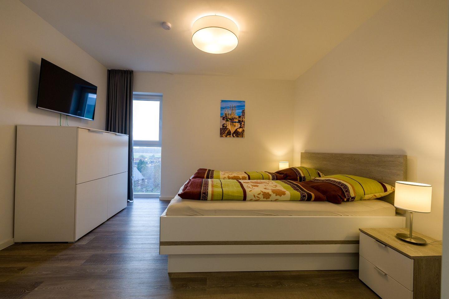 Alle drei Schlafzimmer sind mit einem Doppelbett, Nachtkonsolen, einem Kleiderschrank und einem Fernseher möbliert. Die Einrichtung ist modern und hochwertig.