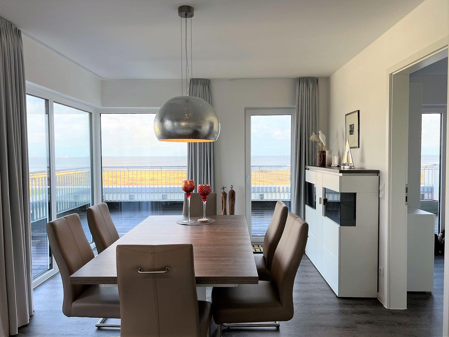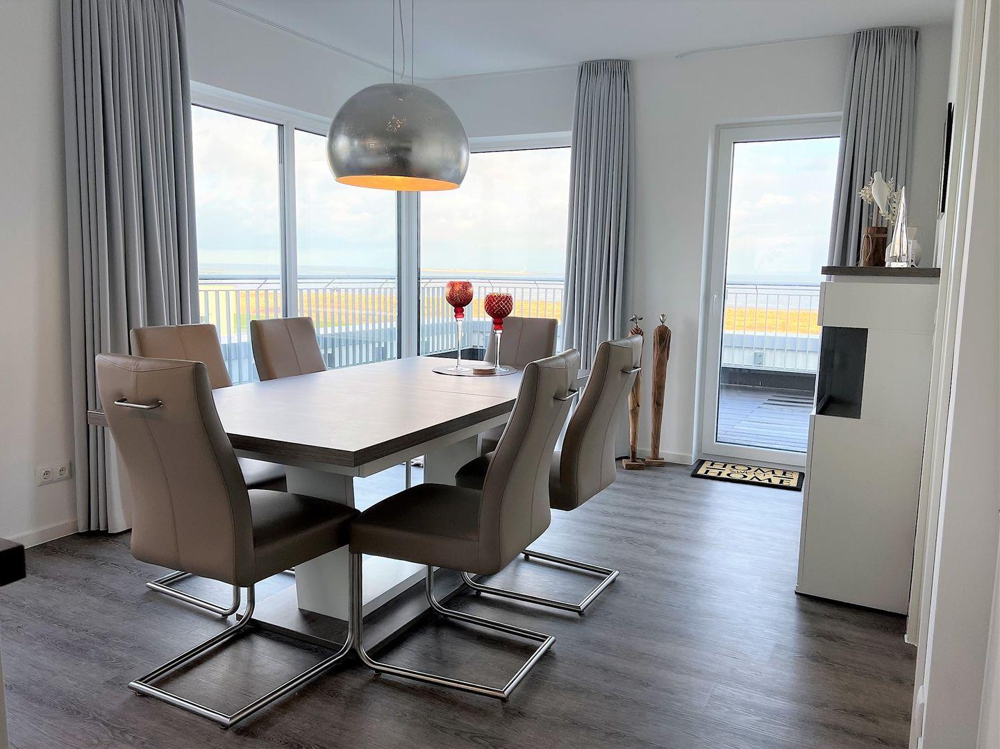 Der großzügige Wohn- Essbereich ist in warmen Farben möbliert und wird durch einen Kaminofen vollendet. Bei dem bekannten "friesischen Schietwetter" unterstreicht besonders dieser das gemütliche Ambiente.