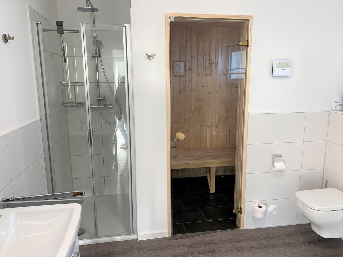 An stürmischen und/oder regnerischen Tagen wird das Badezimmer mit seiner Vollausstattung zum Wellnesstempel. Eine Sauna, eine Regendusche und eine Badewanne bieten den nötigen Komfort zum Relaxen. Saunadüfte für Ihre persönlichen Saunamomente können Sie an unserer Rezeption erwerben.