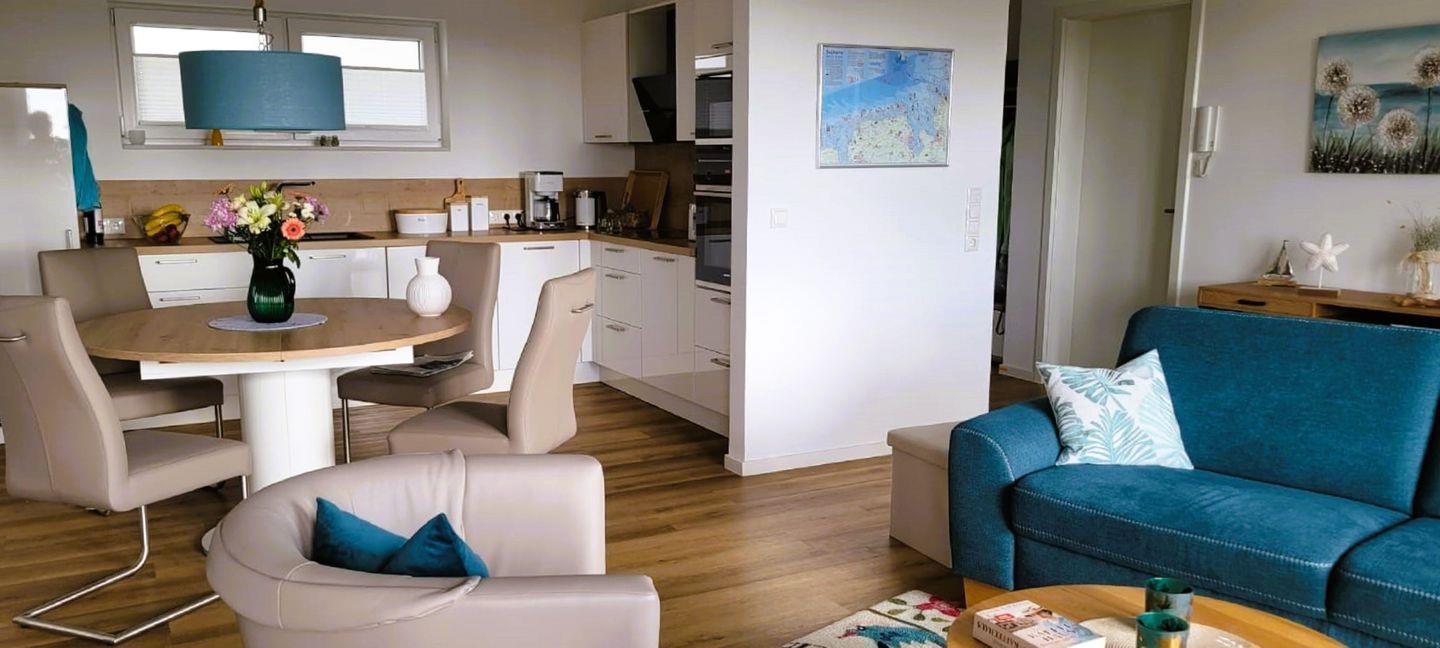 Moderne Ferienwohnung mit Sauna, Balkon und Meerblick in Wangerland, strandnah und komfortabel ausgestattet.