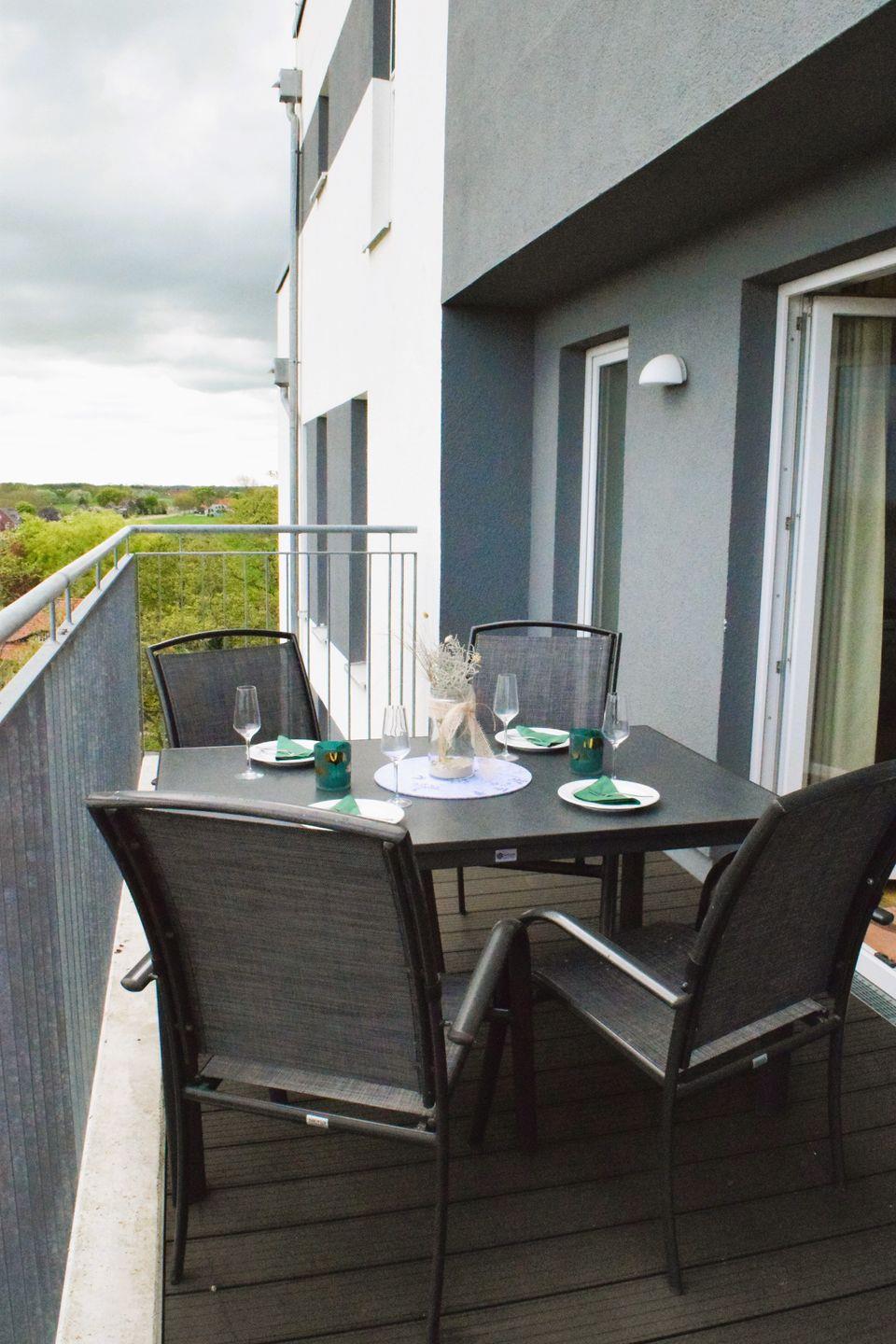 Ein großzügiger, möblierter und nach Osten ausgerichteter Balkon lädt zum Verweilen ein.