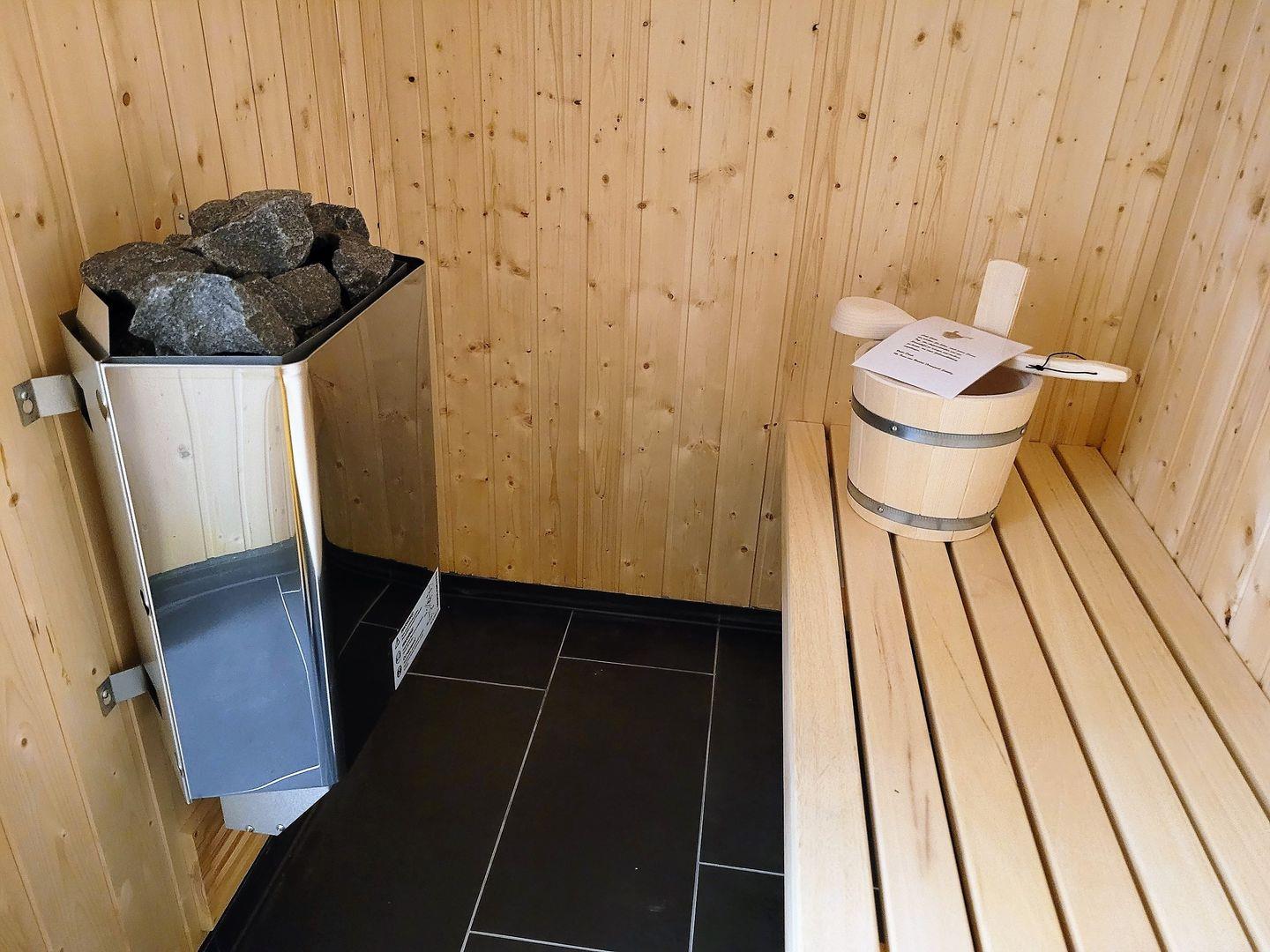 Eine Sauna, eine Regendusche und eine Badewanne bieten den nötigen Komfort zur Erholung.