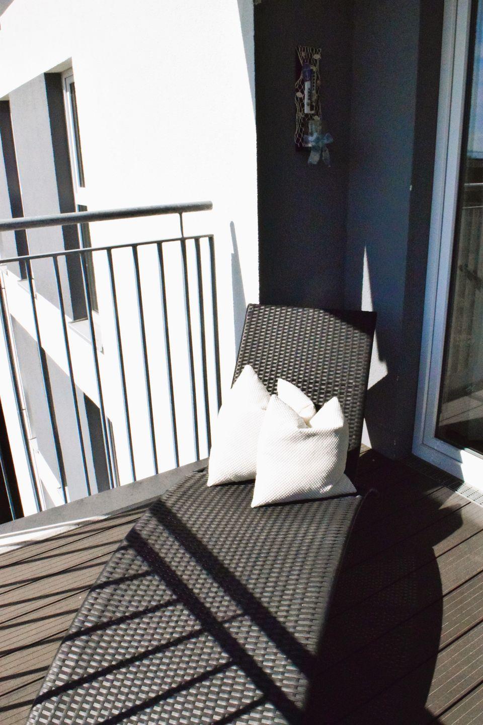 Ein großzügiger, möblierter und nach Osten ausgerichteter Balkon lädt zum Verweilen ein.