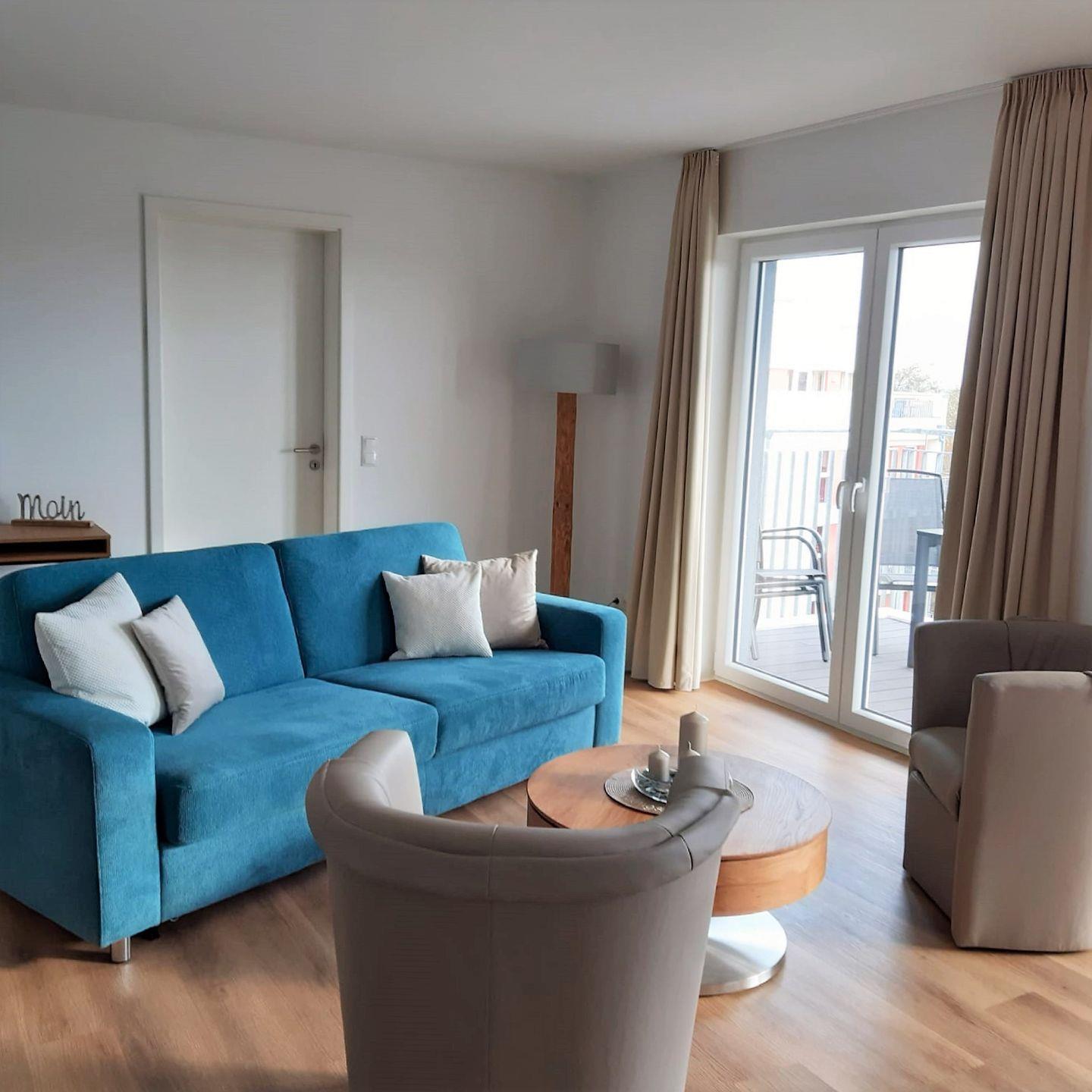 Der helle und freundliche Wohnbereich verfügt über ein Sofa, einen Couchtisch, zwei Sessel und einem Fernseher.