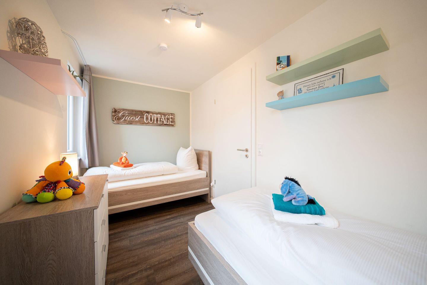 Die erste Etage wird Sie begeistern: Zwei komfortable Schlafzimmer mit einem 180x200m Doppelbette (2x 90x200 Matratzen) sowie 2 Einzelbetten (90x200 Matratzen) und ein großzügiges Bad mit ebenerdiger Dusche, Badewanne und Sauna laden dazu ein, stürmische oder regnerische Tage zu genießen. Tauchen Sie ein in Ihren privaten Wellnes stempel und lassen Sie die Seele baumeln.