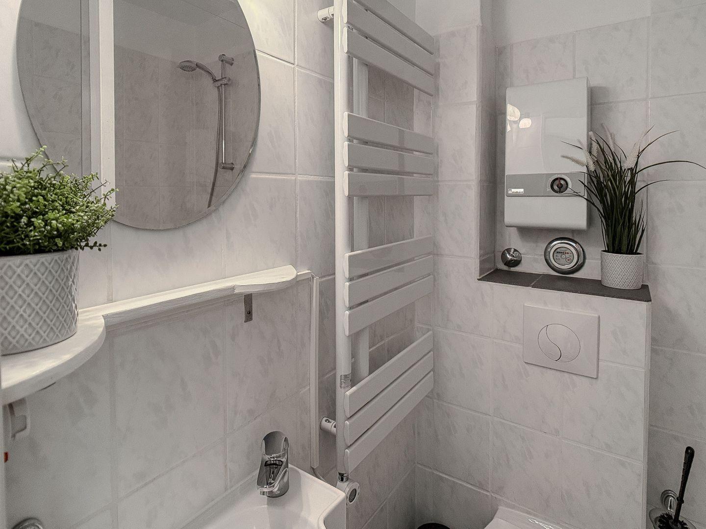 Das Badezimmer ist klein, aber fein und bietet alles, was Sie für Ihre tägliche Hygiene benötigen – von der Dusche bis hin zu den praktischen Ablagemöglichkeiten.