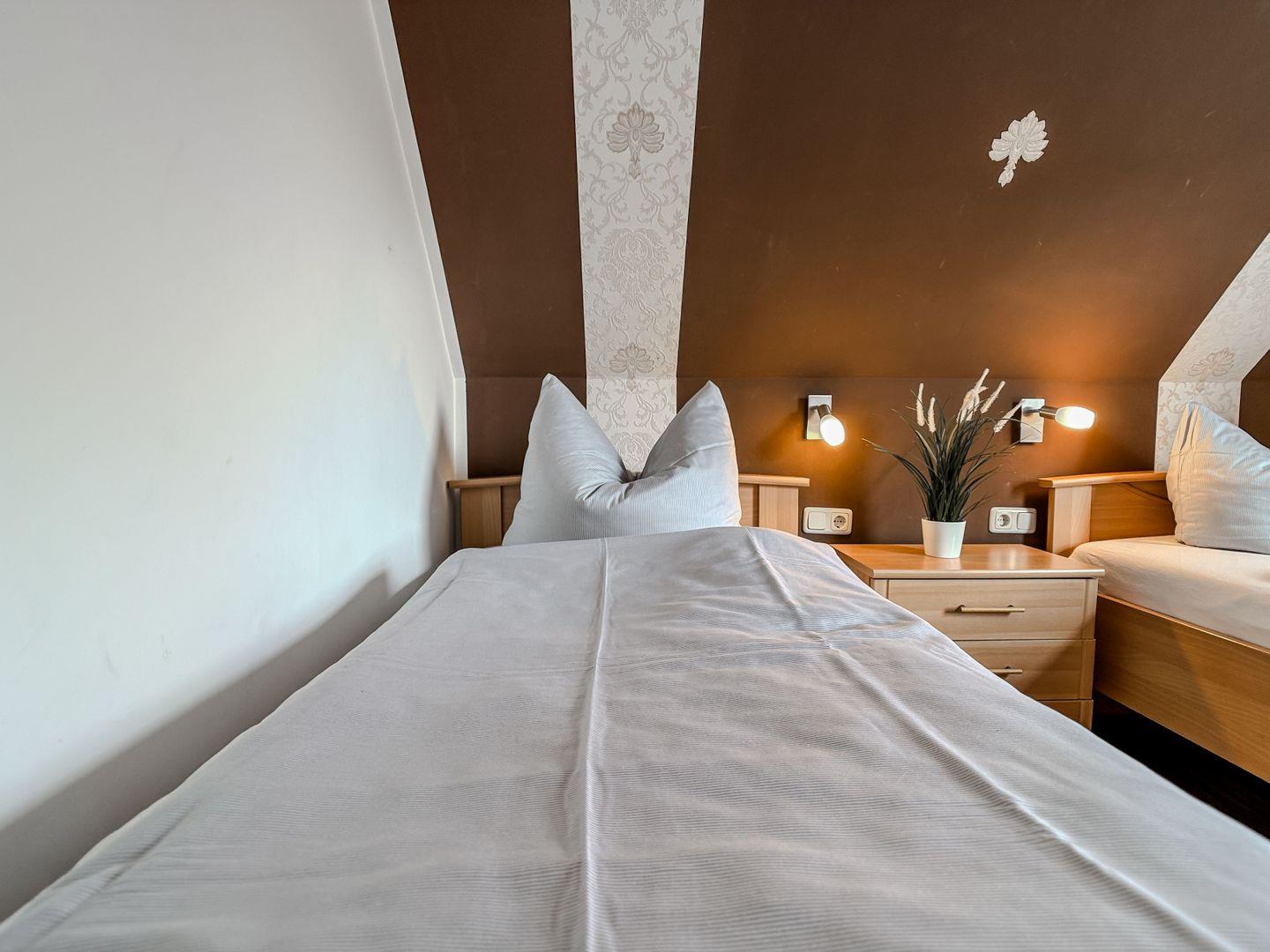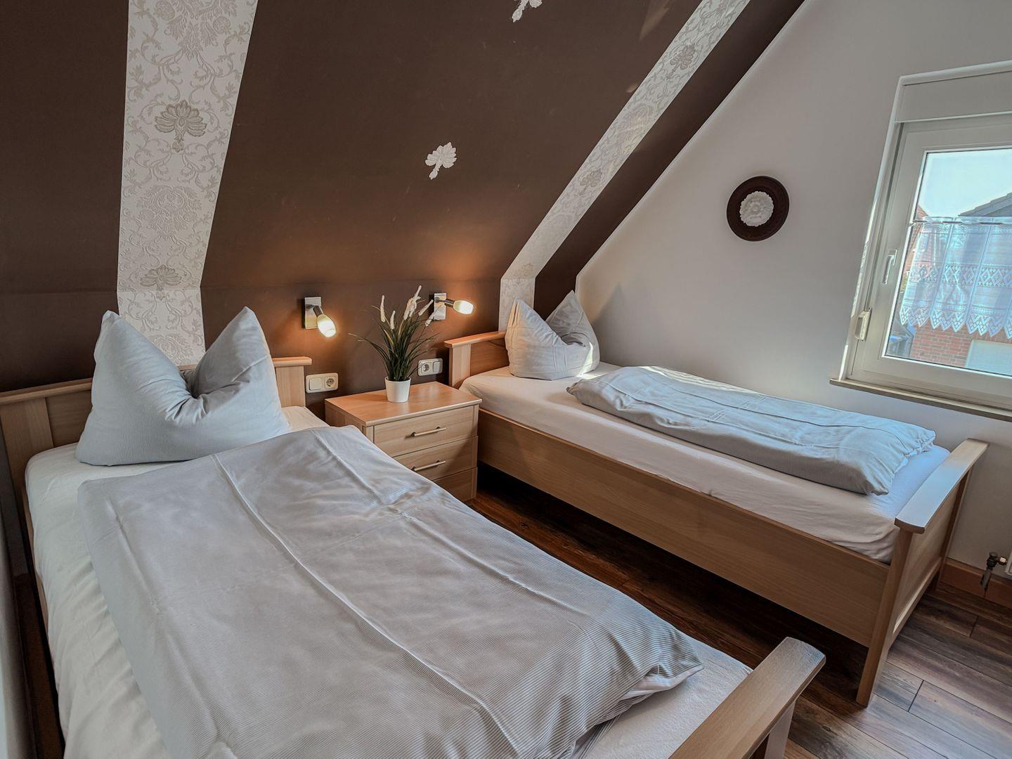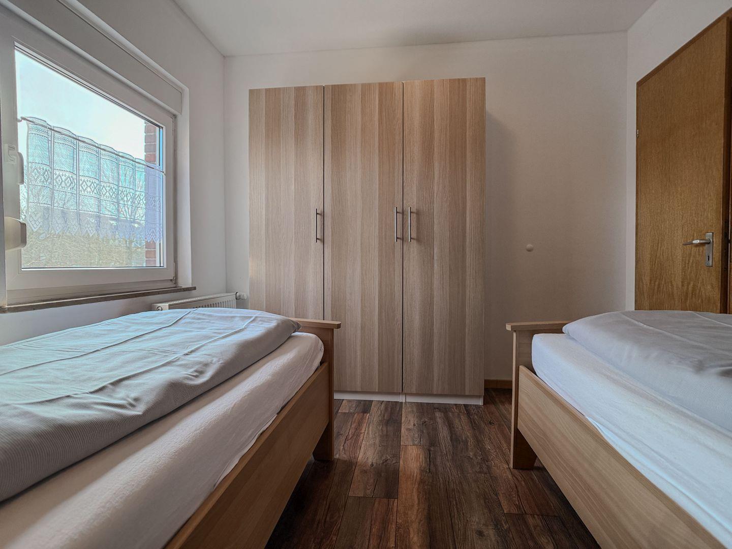 - Einzelbetten, Nachttisch, Nachttischlampe, Kleiderschrank