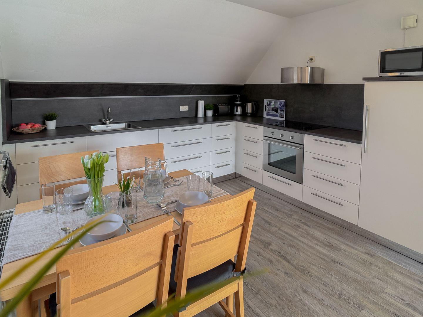 - 4 Ceranfelder, Backofen, Kühlschrank, Gefrierfach, Spülmaschinen, Mixer, Wasserkocher, Toaster, Kaffeemaschine, Mikrowelle
