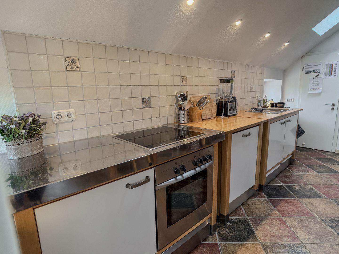 Der bis unters Dach offene, großzügige Wohnbereich mit wunderschön gearbeitetem altem Gebälk, verfügt über eine moderne Küchenzeile inkl. Ofen, Herd und Mikrowelle.