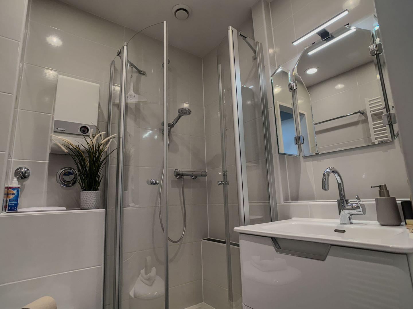 Die kleine, aber gut ausgestattete Küche bietet alles, was Sie für eine unkomplizierte Selbstversorgung benötigen. Das helle Badezimmer ist modern und freundlich gestaltet.