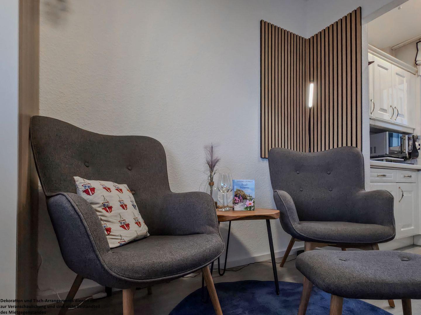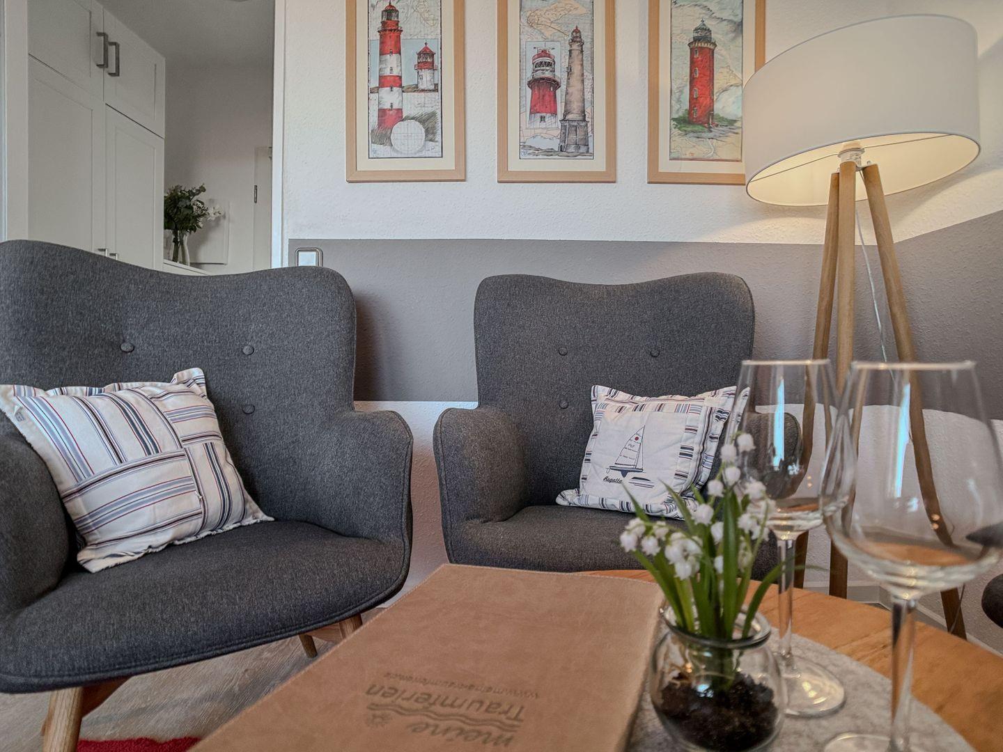 Ein Tresen mit zwei Stühlen lädt zum Frühstück ein, zwei Sessel zum Entspannen. Auf dem großen Balkon genießen Sie gemeinsame Stunden im Strandkorb.