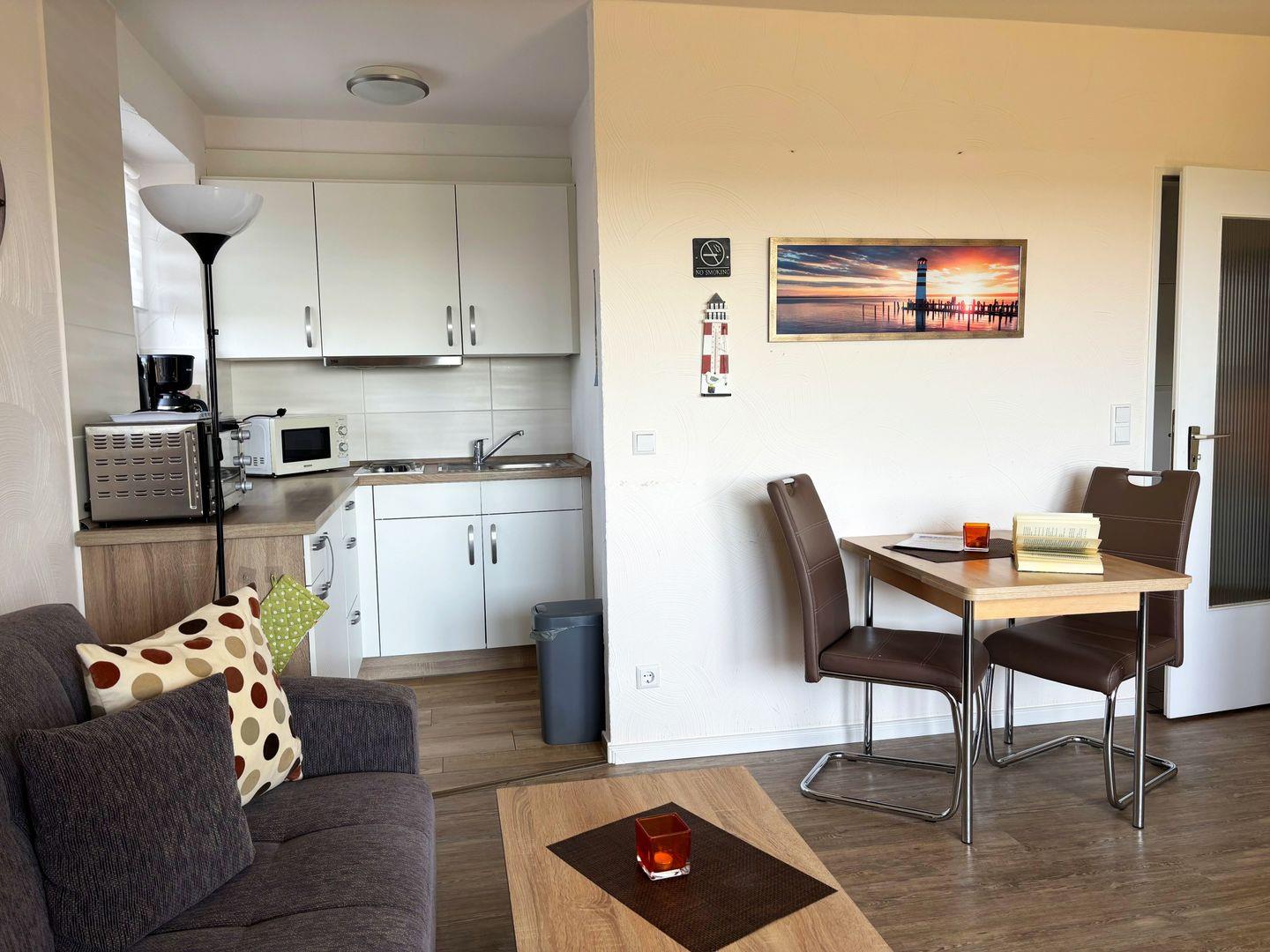 Das Wohnzimmer mit offener Küche, einem extra Essbereich und einer schönen Wohnlandschaft laden zum entspannen ein. Die Küche ist modern und zweckmäßig mit Mikrowelle mit Grill, Senseo-Kaffeemaschine, Kaffeemaschine und Wasserkocher eingerichtet.
