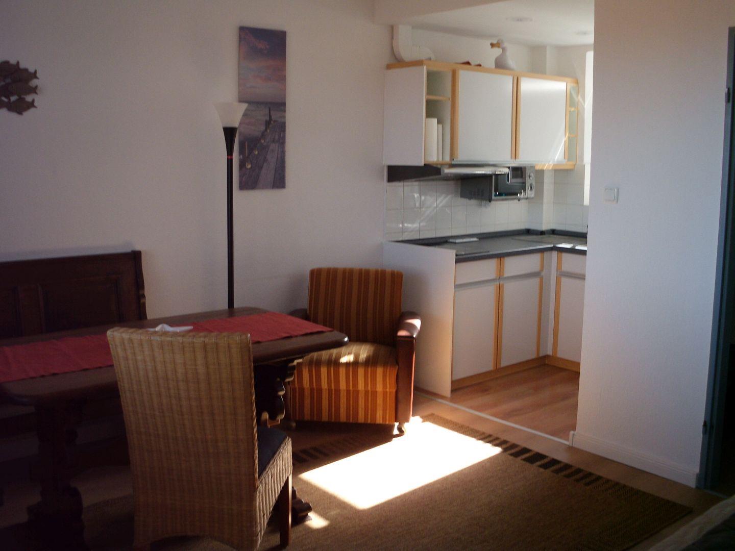 Das helle und zentral, aber in ruhiger Lage in Horumersiel gelegene Ferienapartment ist komfortabel über den Fahrstuhl zu erreichen und verfügt über einen Wohnraum mit Sitzecke und TV, einer Küchennische sowie einer kleinen Essecke mit Zugang zum Balkon.