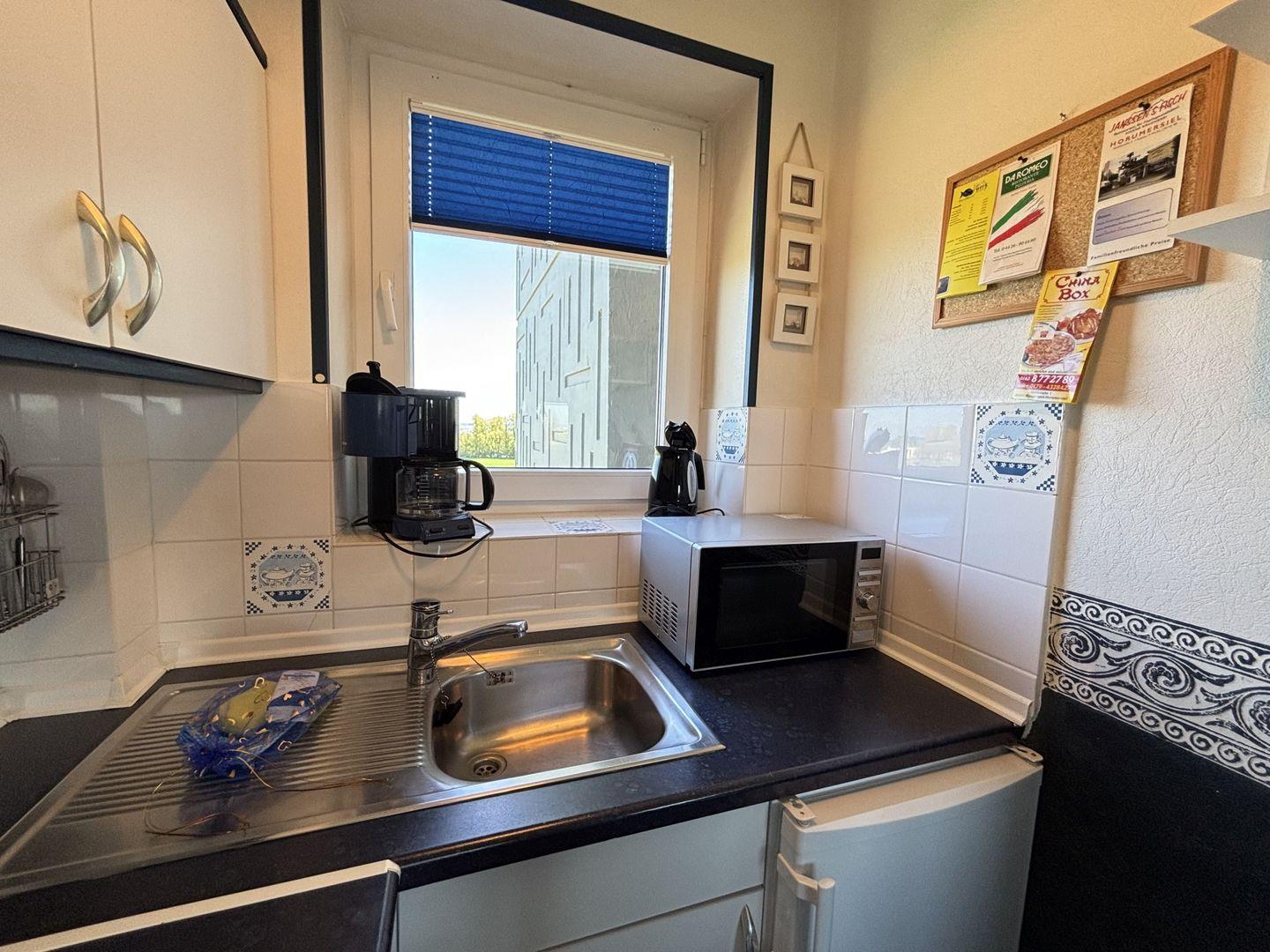 Diese helle und freundliche Wohnung befindet sich im 5`ten Stock, mit dem Fahrstuhl gut zu erreichen. Es ist ein kombinierter Wohn und Schlafraum, der eingerichtet ist mit einem Doppelschrankbett, einem Einzelbett, einer Sitzecke, einem Fernsehsessel und einem TV-Flachbilschirm. Die Küche ist mit einem 4 Platten Ceranfeld, mit Backofen und dazugehörigem Geschirr und Besteck ausgestattet.
