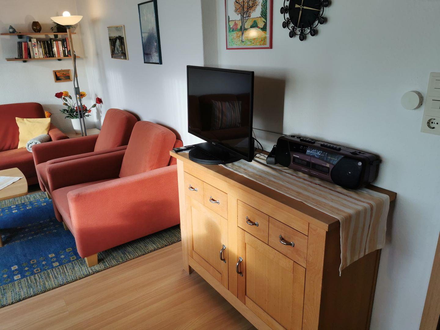 Ein gemütliches Sofa sowie zwei Sessel die sich im Wohnzimmer befinden, laden zum gemütlichen Entspannen ein.
