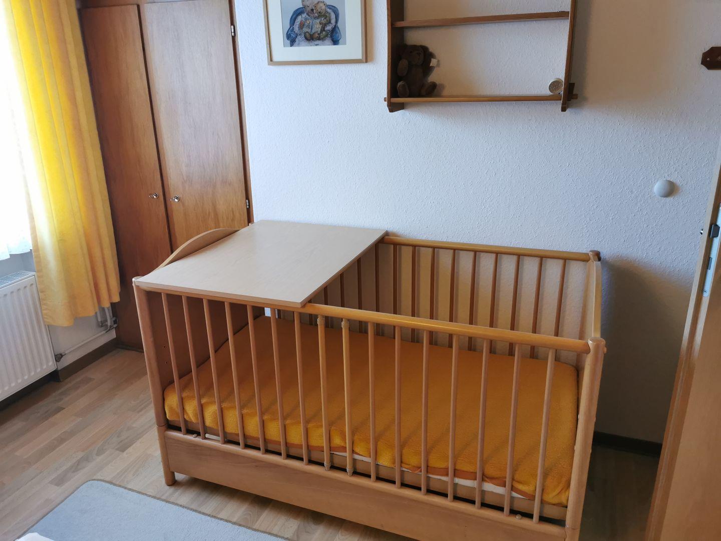 Der geräumige zweite Schlafraum ist mit einem Doppelbett und einem Kinderbett ausgestattet.
