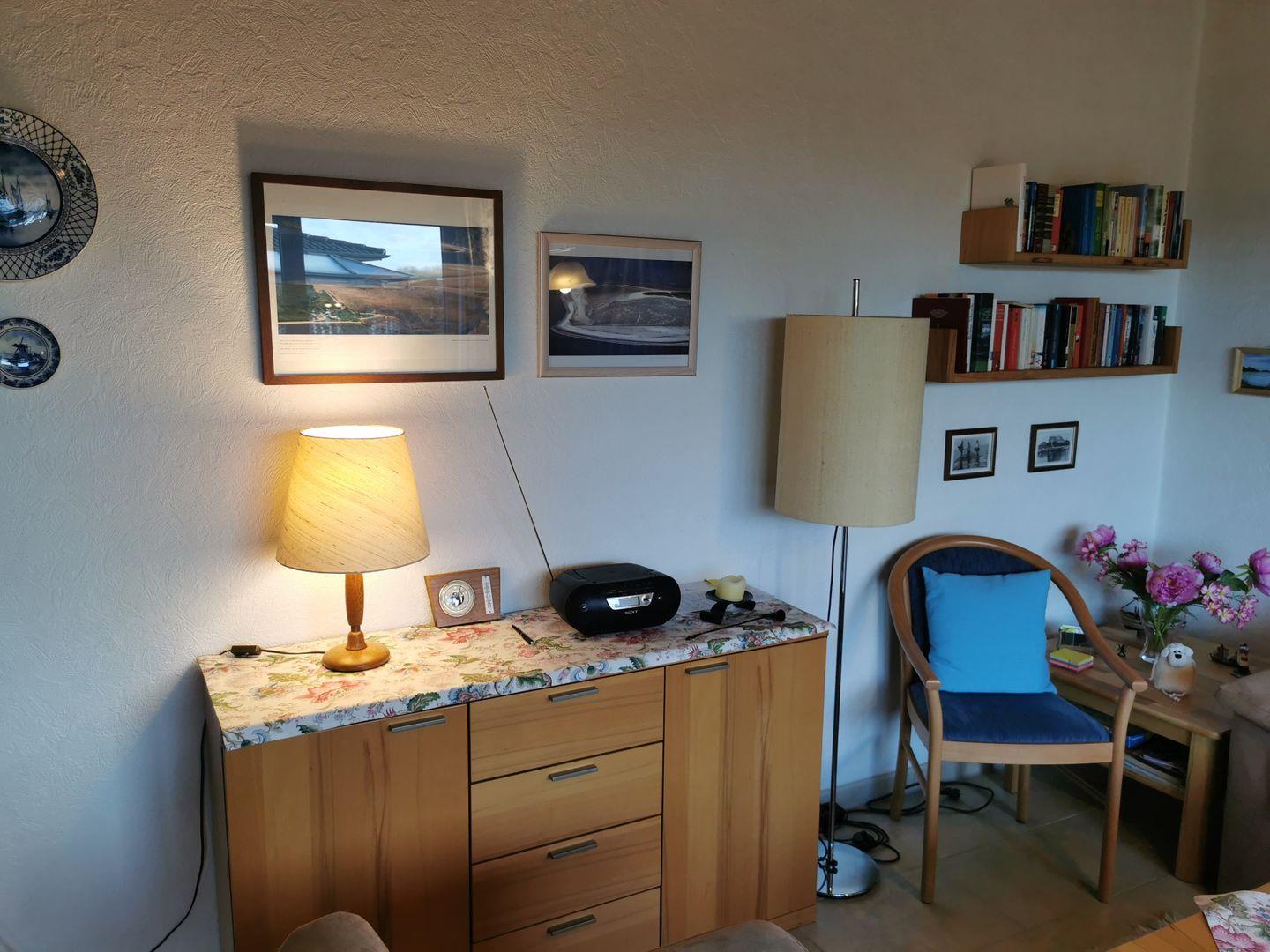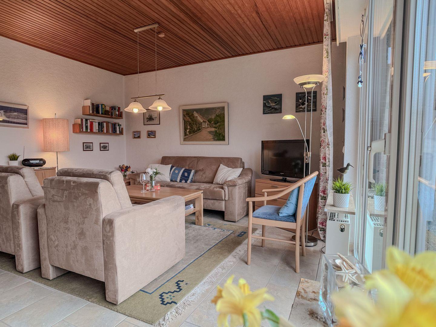 Lichtdurchflutet und offen empfängt Sie der Wohn- und Küchenbereich. Auf dem gemütlichen Sofa oder in einem der beiden Sessel können Sie nach einem Spaziergang am Strand die Seele baumeln lassen. Die angrenzende Küche lädt zum gemeinsamen Kochen ein und bietet alles, was Sie für eine unkomplizierte Selbstversorgung brauchen – inklusive einer Waschmaschine für längere Aufenthalte.