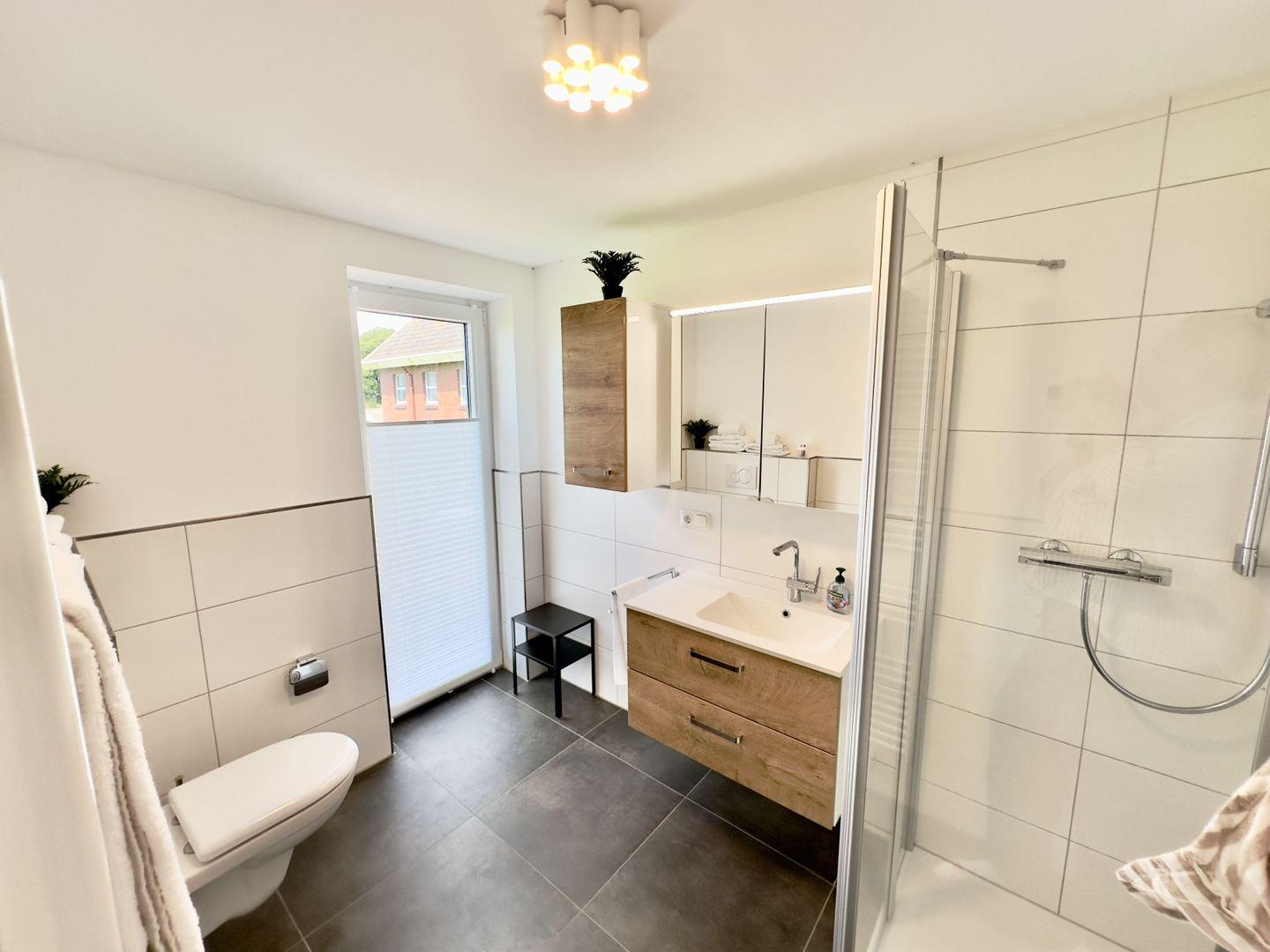 Das helle Tageslichtbad begeistert mit einer großzügigen, barrierefreien Dusche und einem praktischen Spiegelschrank. Der Waschbeckenunterschrank bietet zusätzlichen Stauraum für Ihre persönlichen Dinge.