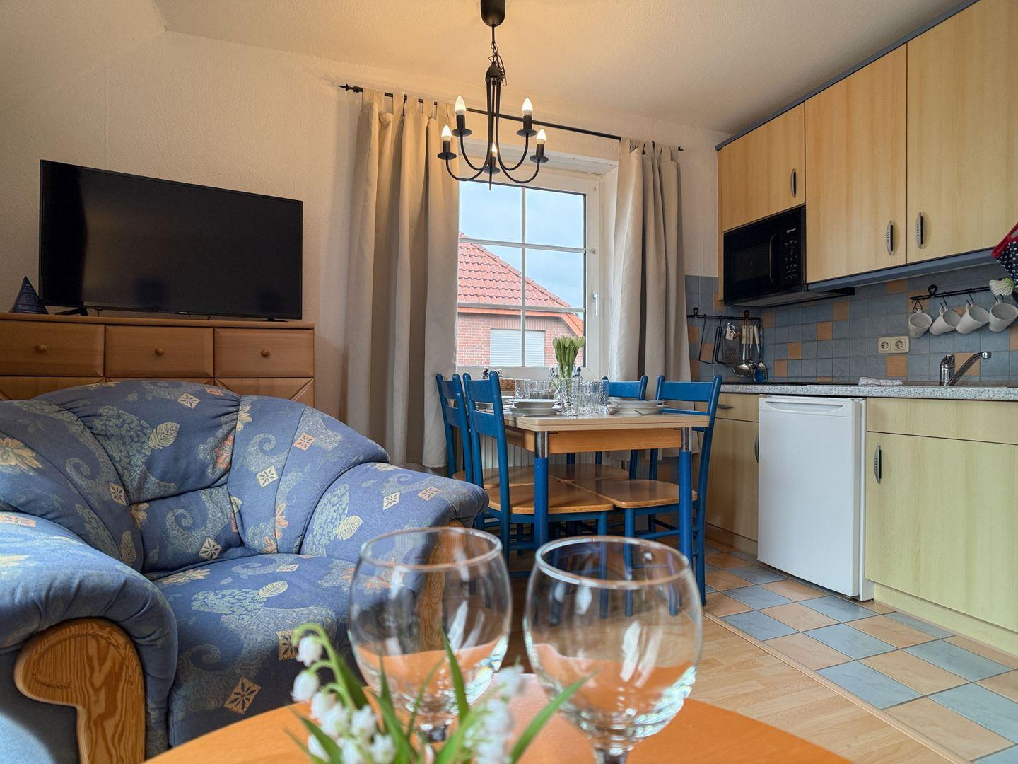 Das gemütliche Wohnzimmer ist mit einer Essecke ausgestattet, die Platz für bis zu 4 Personen bietet. Hier können Sie Ihre Mahlzeiten genießen und gemeinsame Zeit verbringen. Die integrierte Küchenzeile verfügt über alle notwendigen Annehmlichkeiten, um sich selbst zu versorgen, von Herd und Kühlschrank bis hin zu Kochutensilien.
