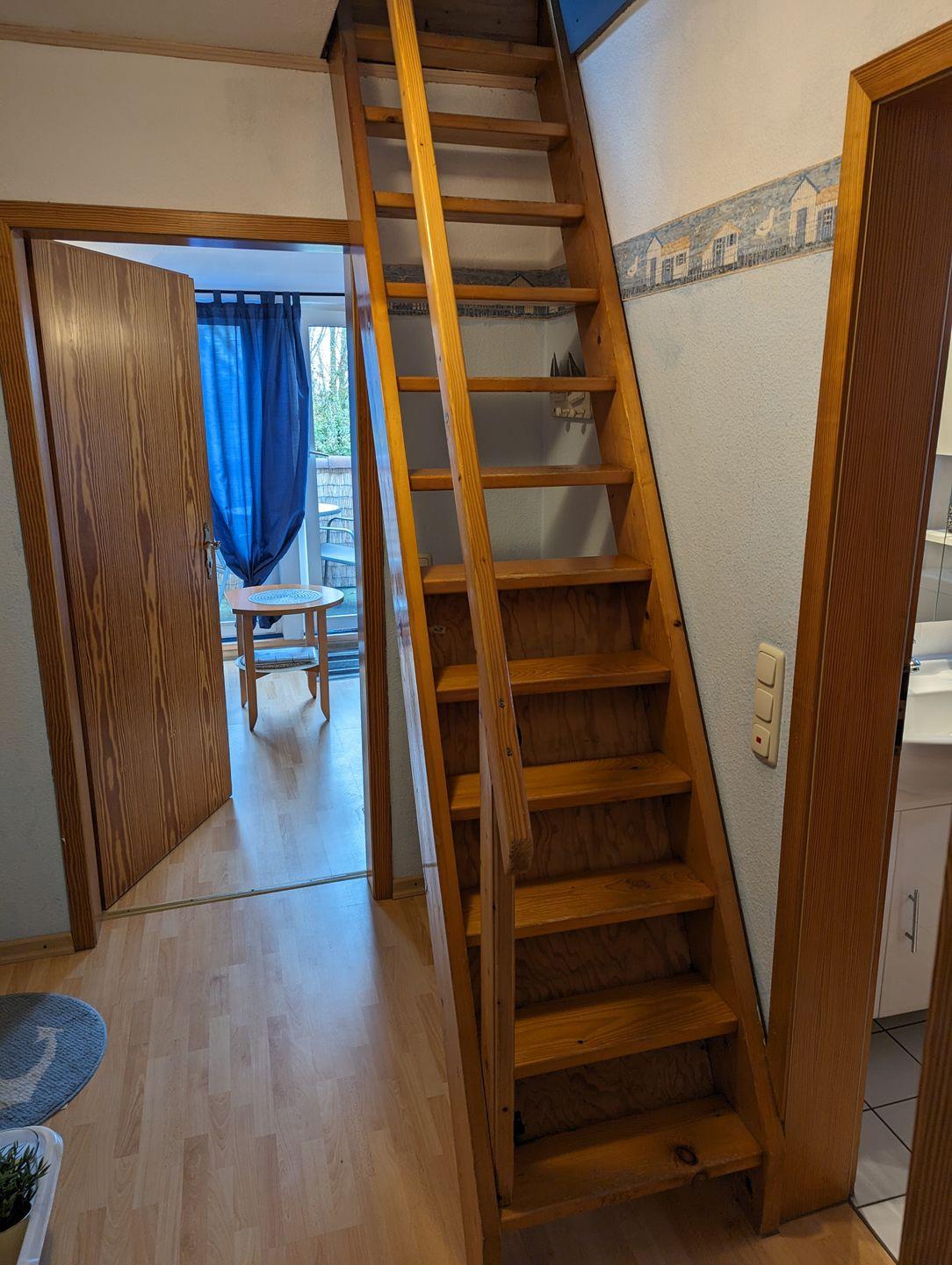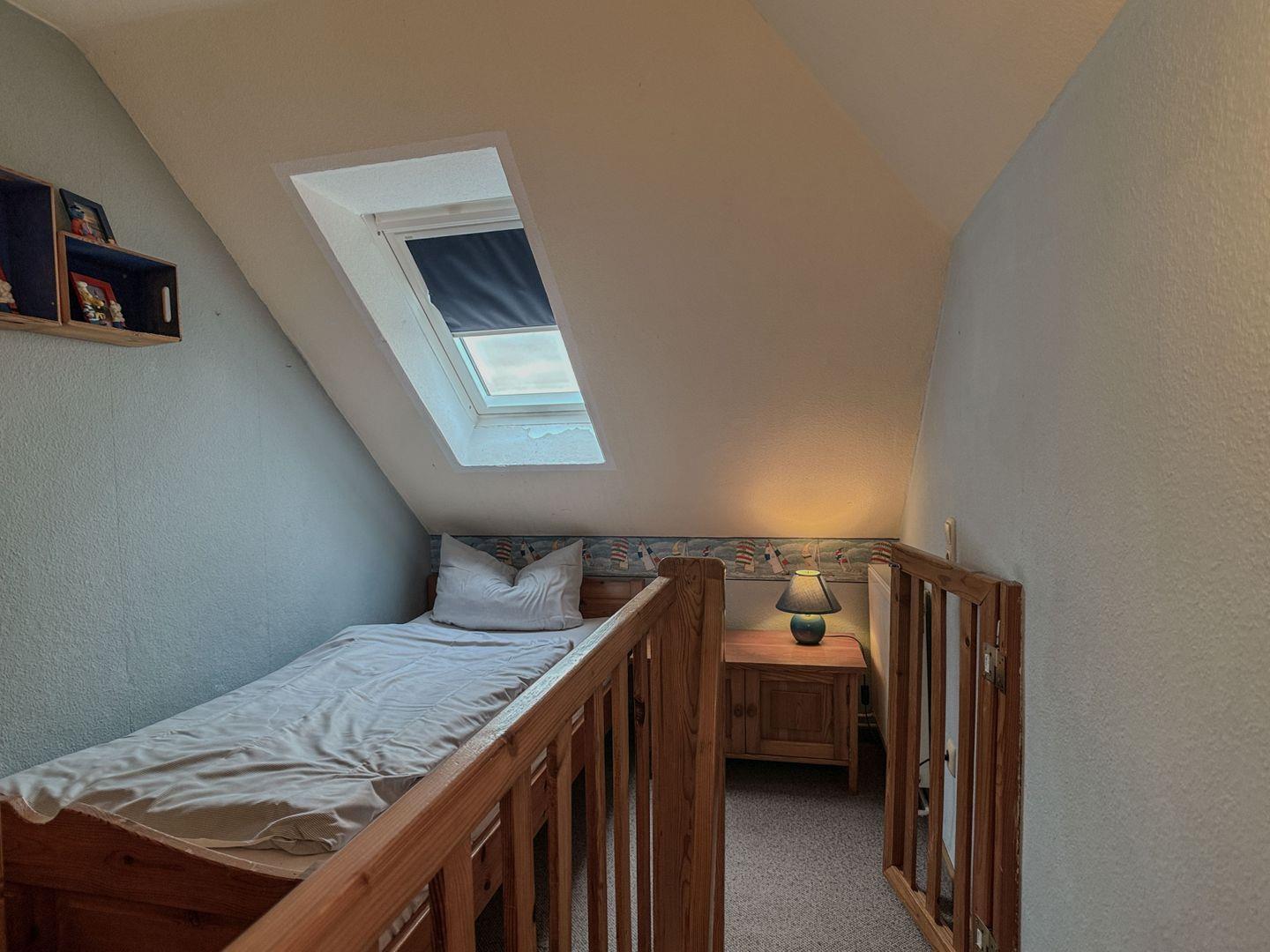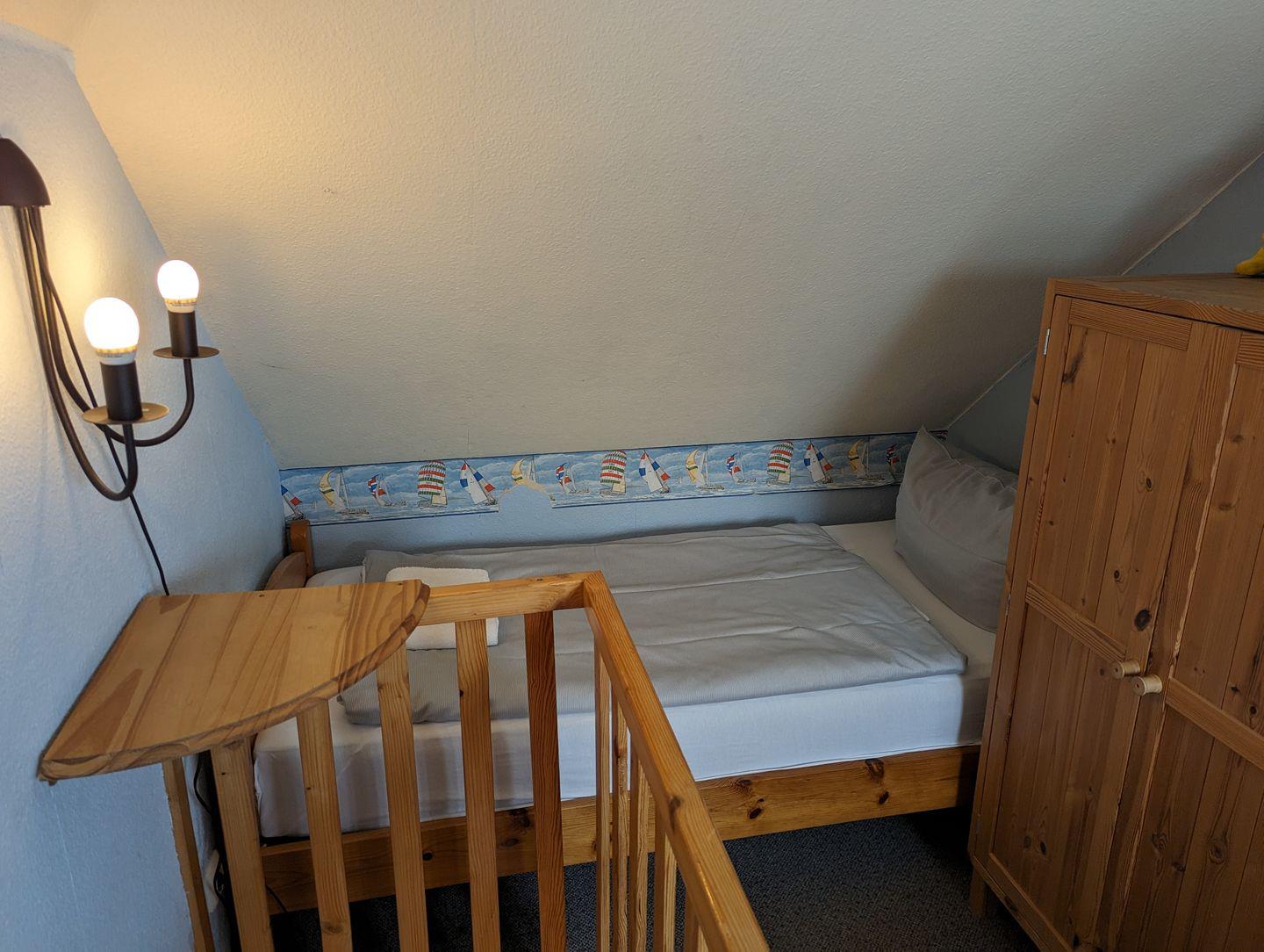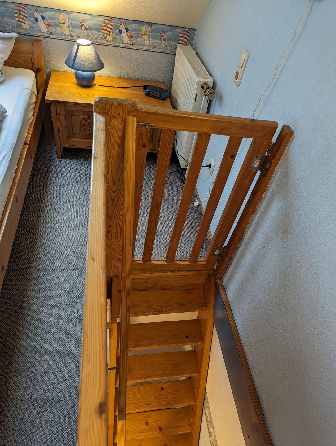 Eine steile Treppe führt zum zweiten Schlafzimmer, das mit einem stabilen Geländer gesichert ist. Ein Treppenschutz für Kinder befindet sich sowohl am oberen als auch am unteren Bereich der Treppe. Das obere Schlafzimmer verfügt über zwei Einzelbetten und zeichnet sich durch die schrägen Wände aus, die eine gemütliche Atmosphäre schaffen.