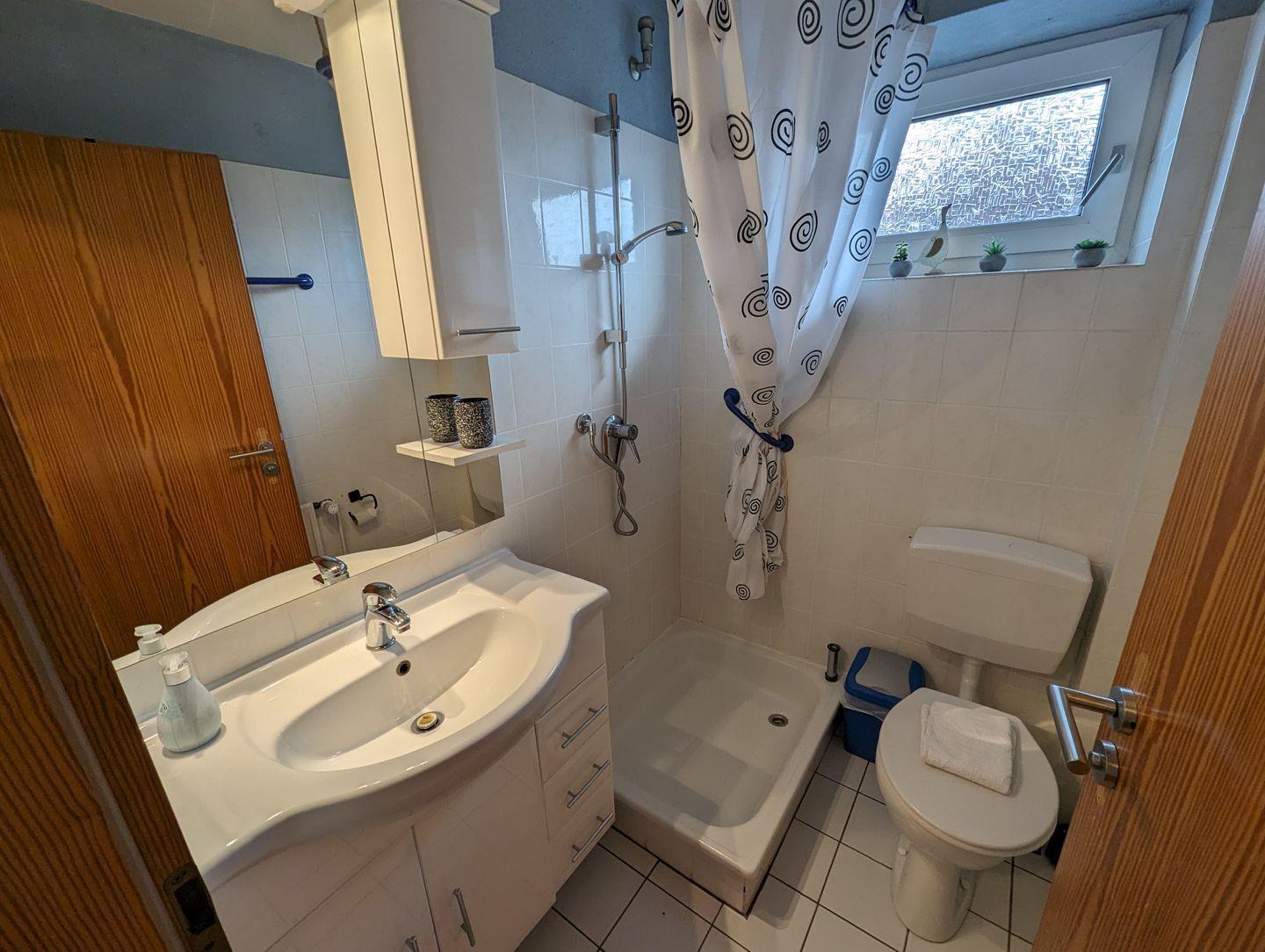 Das kleine, aber moderne Badezimmer verfügt über ein Waschbecken, eine Dusche und eine Toilette. Es bietet alles, was Sie für Ihre tägliche Körperpflege benötigen.