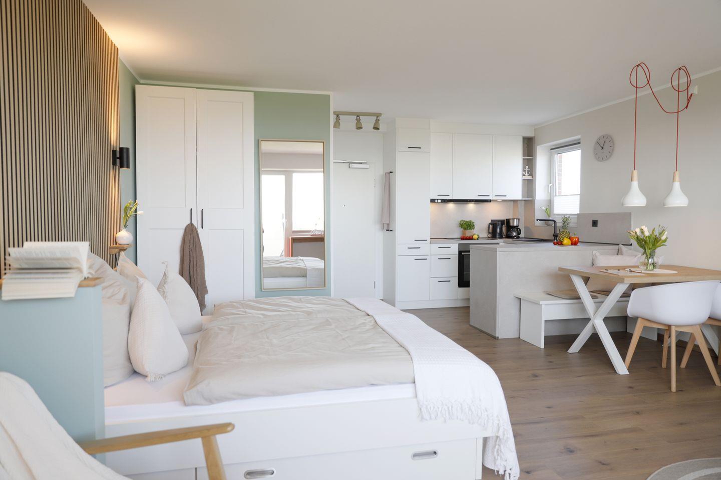 Unser 40 m2 modernes, lichtdurchflutetes Apartment ist 2024 vollumfänglich renoviert worden und hochwertig mit allem Komfort ausgestattet. Die nagelneue, offene Küche bietet ausreichend Platz und ist bestens ausgestattet: Spülmaschine, Backofen, 4 Kochstellen-Ceranfeld, Kühlschrank mit Gefrierfach, Kaffeemaschine & Wasserkocher, Toaster.