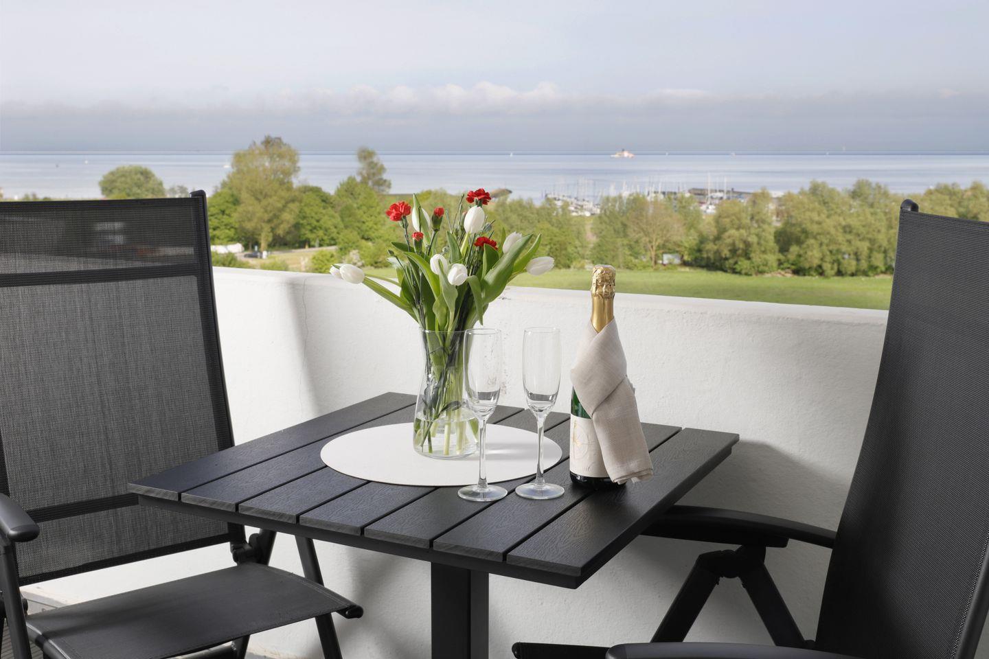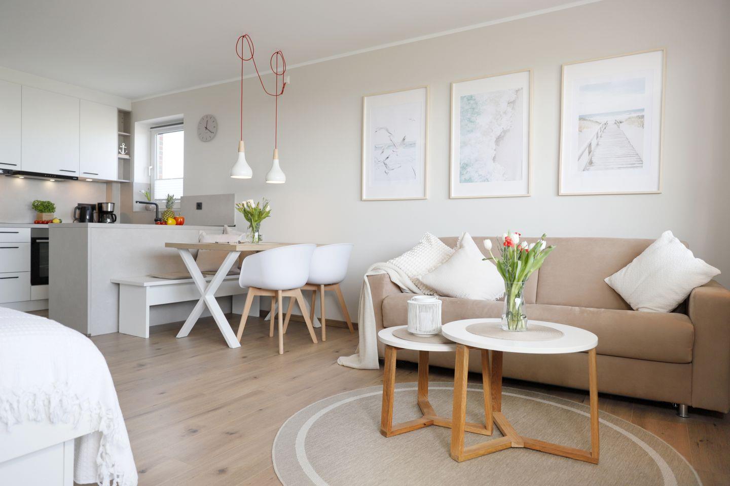 Eine großzügige Sitzecke grenzt direkt an die Küche, alternativ können Sie Ihre Mahlzeit oder einen frischen Kaffee von unserem persönlichen Lieblingsplatz aus - einem 2,5 m langen Bartisch mit Hochstühlen direkt entlang der Fensterfront mit Meerblick - genießen!