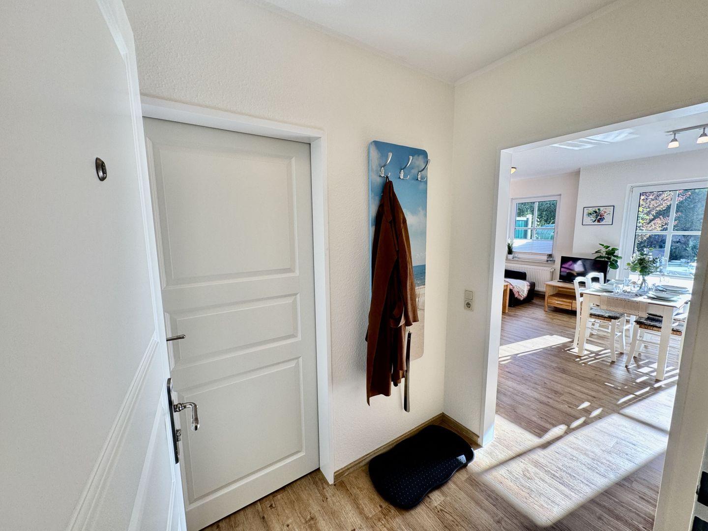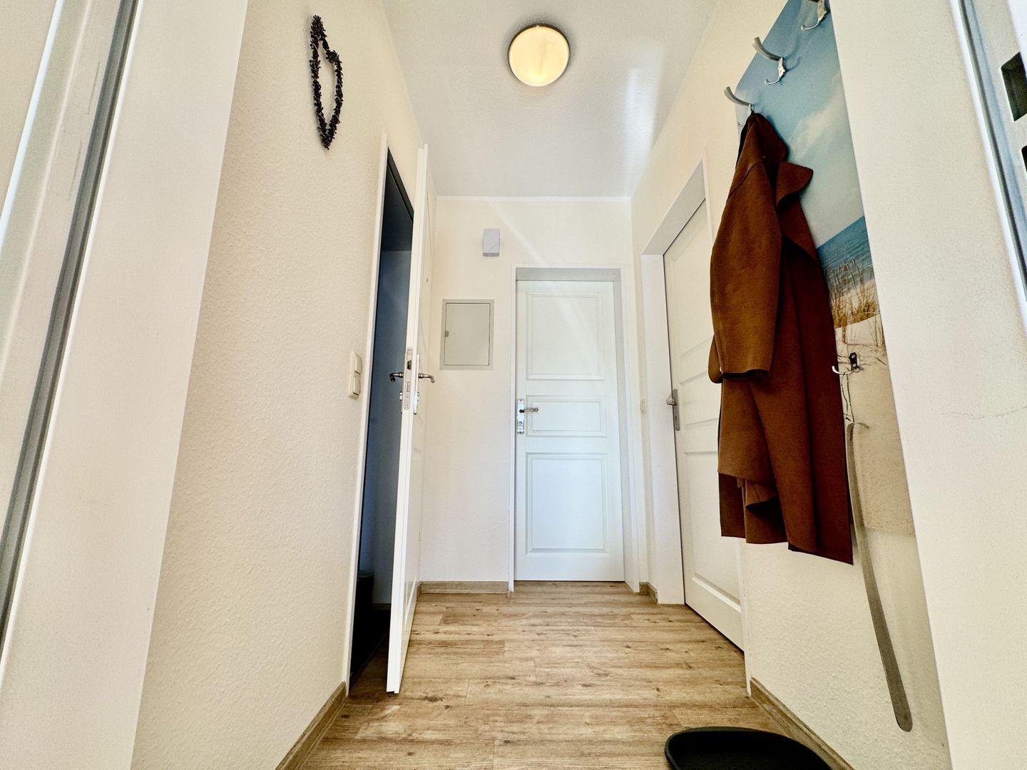 Die Ferienwohnung Tidenhuus in Horumersiel ist ein Ort voller Charme und Ruhe, eingebettet in eine grüne, dennoch zentral gelegene Wohnanlage. Auf 56 qm finden bis zu 4 Personen ein behagliches Zuhause für ihren Urlaub. Schon beim Betreten des Flurs erwartet Sie ein einladendes Ambiente: der schöne, in Holzoptik verlegte Vinylboden strahlt natürliche Wärme aus und die praktische Garderobe bietet ausreichend Platz für Jacken und Schuhe.