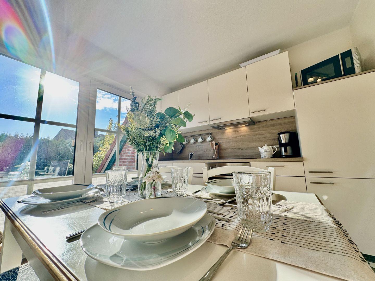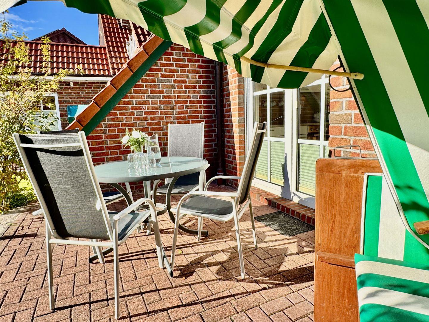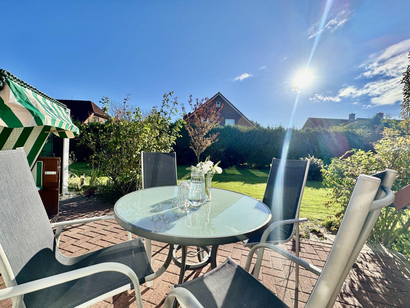 Von hier aus haben Sie Zugang zur sonnigen Terrasse, die mit einem eigenen Strandkorb ausgestattet ist – perfekt für ein Glas Wein am Abend oder entspanntes Sonnenbaden während des Tages. Der Blick in den gepflegten Garten sorgt für eine angenehme, erholsame Atmosphäre.