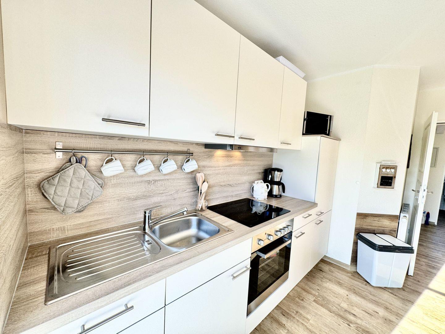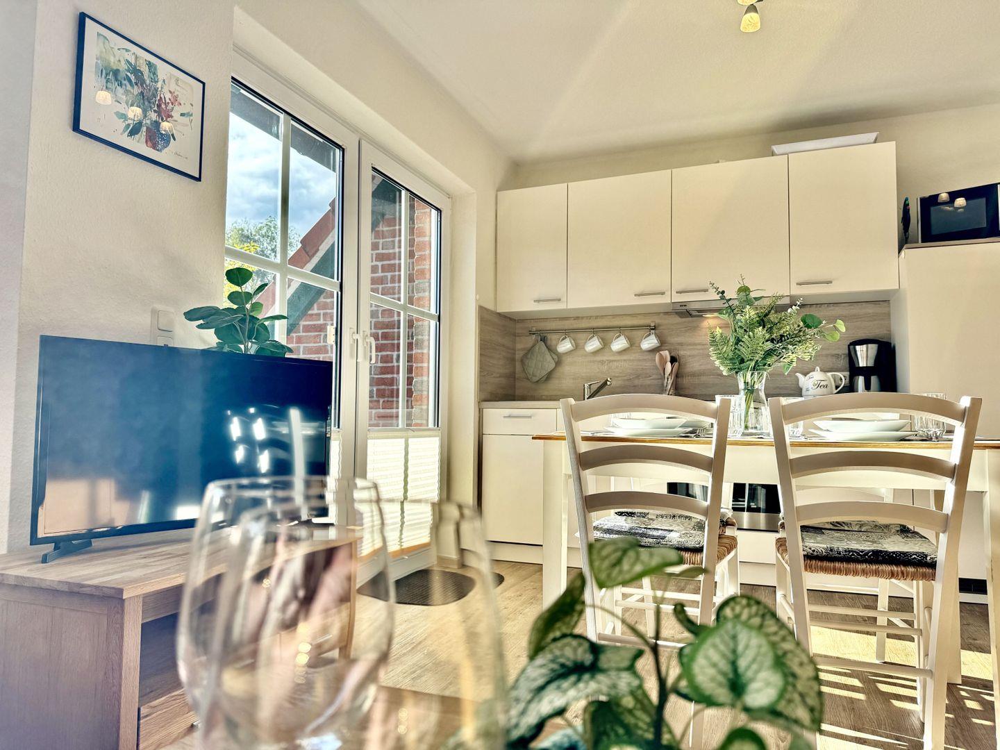 Das helle, liebevoll eingerichtete Wohnzimmer besticht durch Gemütlichkeit. Ein bequemes Sofa und ein Sessel laden zu entspannten Abenden ein, während die große Essgruppe sich ideal für gemeinsame Mahlzeiten oder Spieleabende eignet. Die moderne Küche ist geschickt in den Wohnbereich integriert, sodass Sie auch beim Kochen am Geschehen teilhaben können. Ein besonderes Highlight ist das hinter einer Schrankwand versteckte Schrankbett, das zwei weiteren Personen komfortablen Schlafplatz bietet.