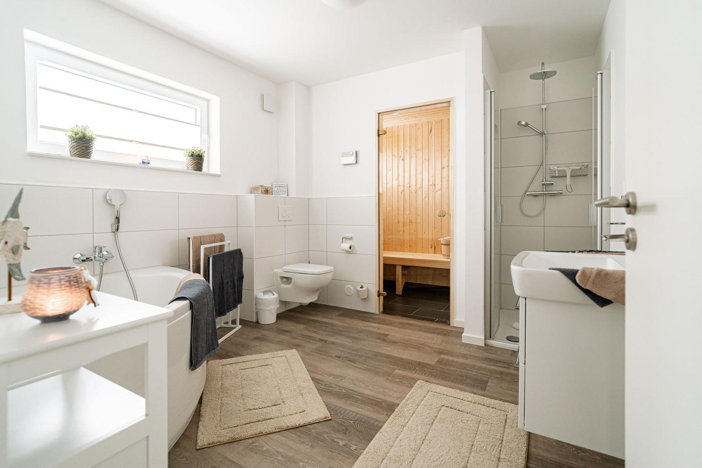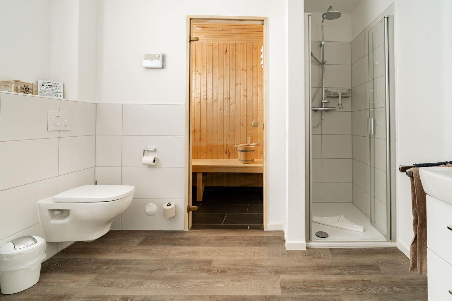 Das Badezimmer in "Graftkieker" bietet eine private Sauna, eine Badewanne und eine leicht zugängliche Dusche. Gönnt Euch einen entspannenden Saunagang oder ein erholsames Bad nach einem Tag am Strand.