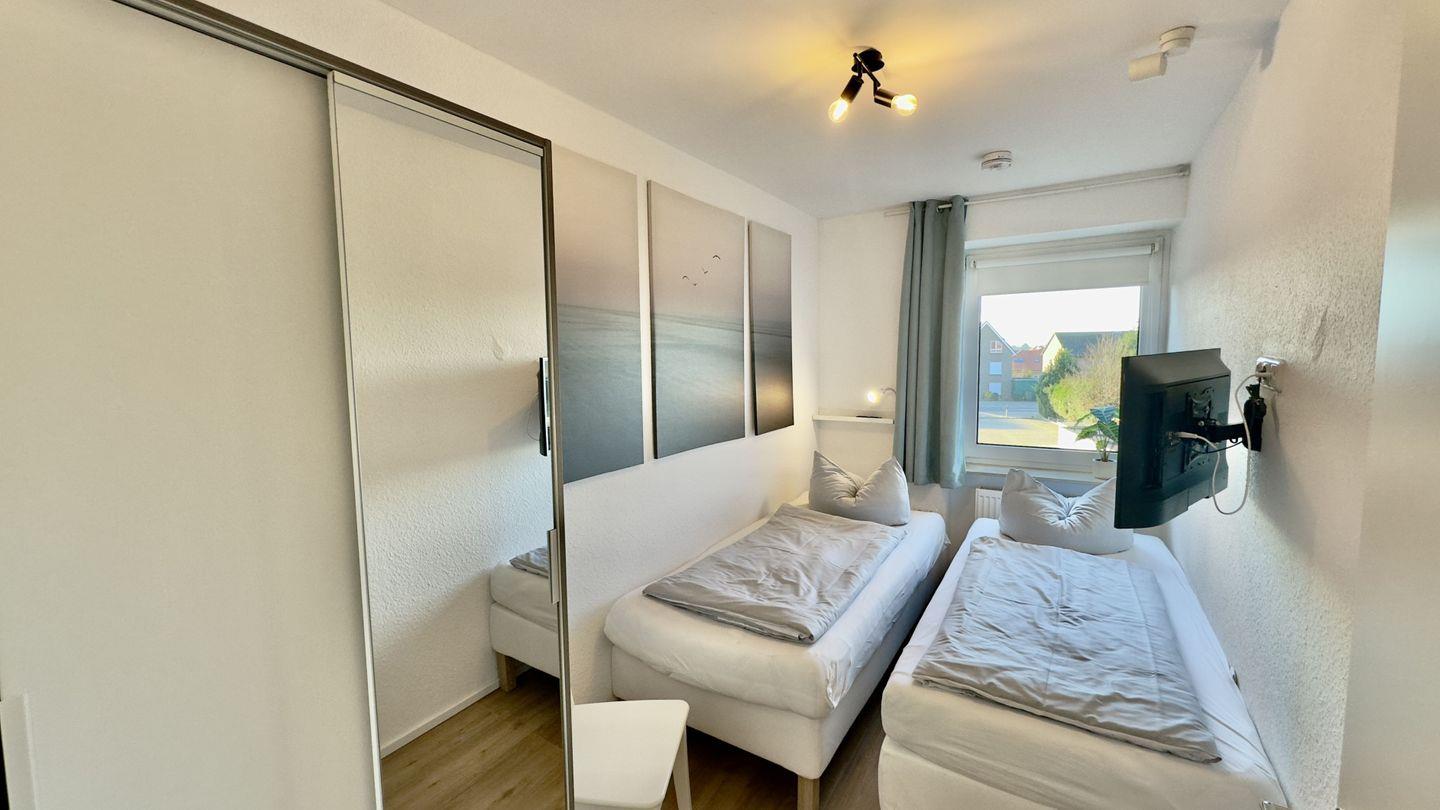Das separate Schlafzimmer mit zwei Einzelbetten (90x 200 Matratzen) und einem Fernseher bietet einen ruhigen Rückzugsort für erholsame Nächte.