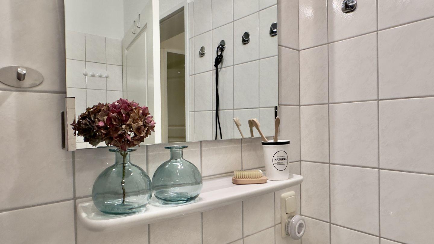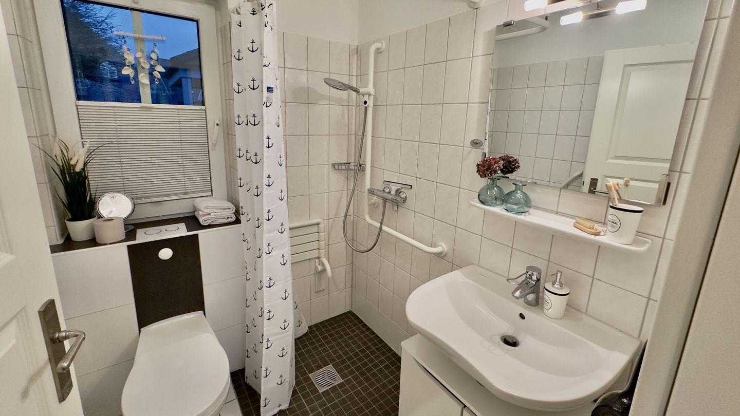 Das modern eingerichtete Tageslichtbad ist ein Highlight für alle, die barrierearme Ausstattung schätzen: eine bodengleiche Dusche, ein klappbarer Sitz und Haltegriffe sorgen für Komfort bei Bewegungseinschränkungen. Ein Kosmetikspiegel und hochwertige Details runden die Ausstattung ab.