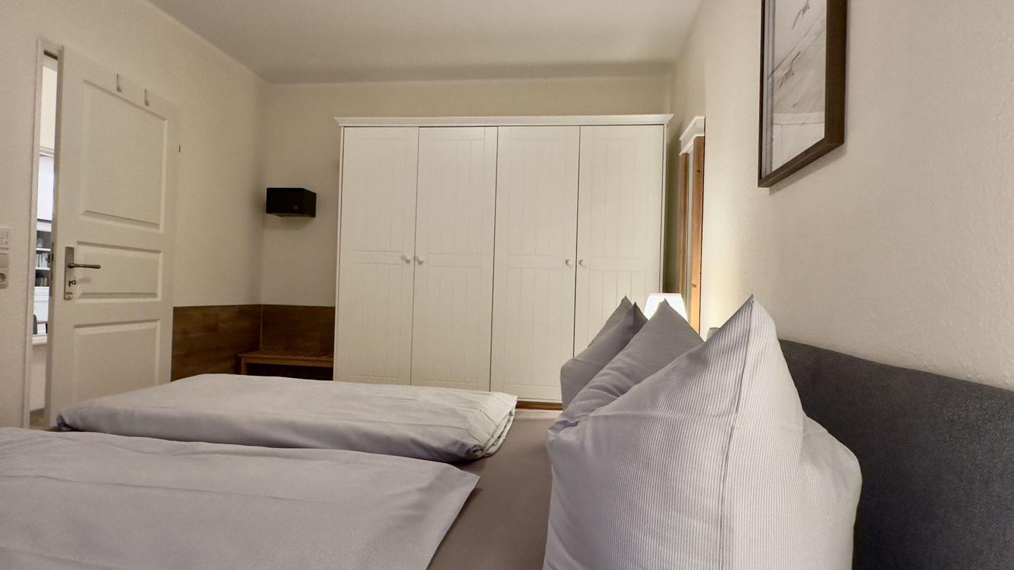 Im separaten Schlafzimmer erwarten Sie ein komfortables Boxspringbett und ein geräumiger Kleiderschrank mit ausreichend Platz für Ihre Garderobe. Hier können Sie sich rundum wohlfühlen und erholsame Nächte genießen.