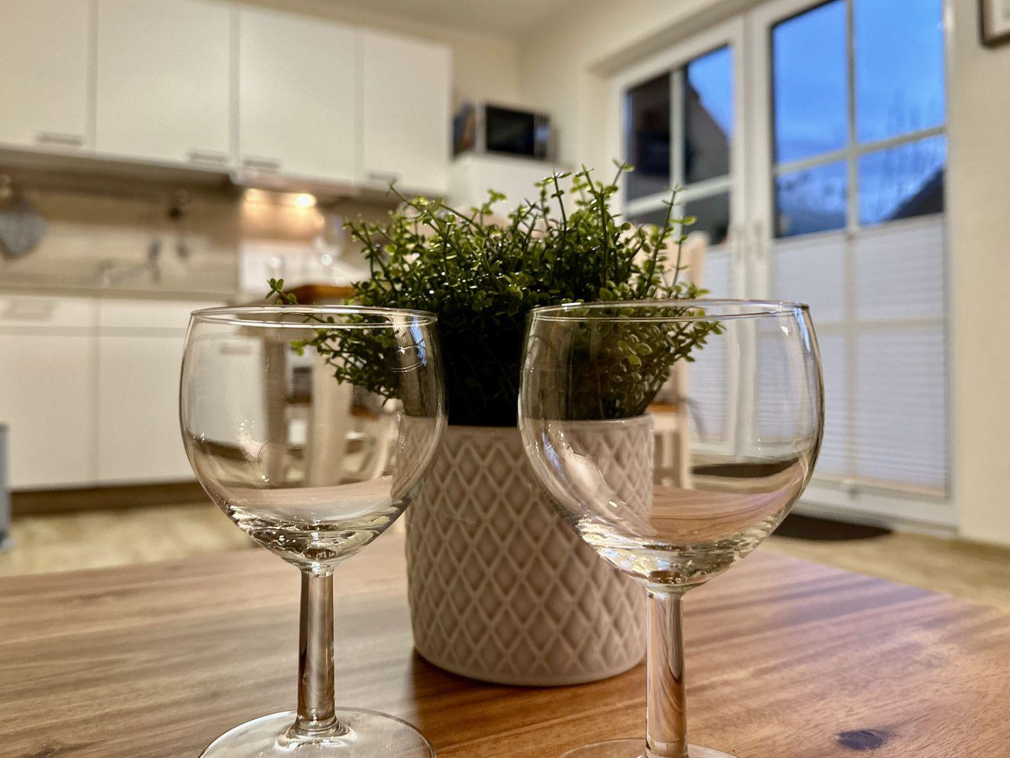 Das offene, lichtdurchflutete Wohnzimmer bietet mit seiner großen Fensterfront einen traumhaften Blick in den Garten. Vom gemütlichen Schlafsofa oder den Sesseln aus können Sie diesen Ausblick in vollen Zügen genießen. Die angrenzende Sitzgruppe lädt zu gemeinsamen Mahlzeiten, lustigen Spieleabenden oder einfach entspannten Gesprächen ein. Die in den Wohnbereich integrierte Küche ist modern und voll ausgestattet – ideal für Selbstversorger. Warme und helle Farbtöne schaffen auch hier eine angenehme Atmosphäre.
