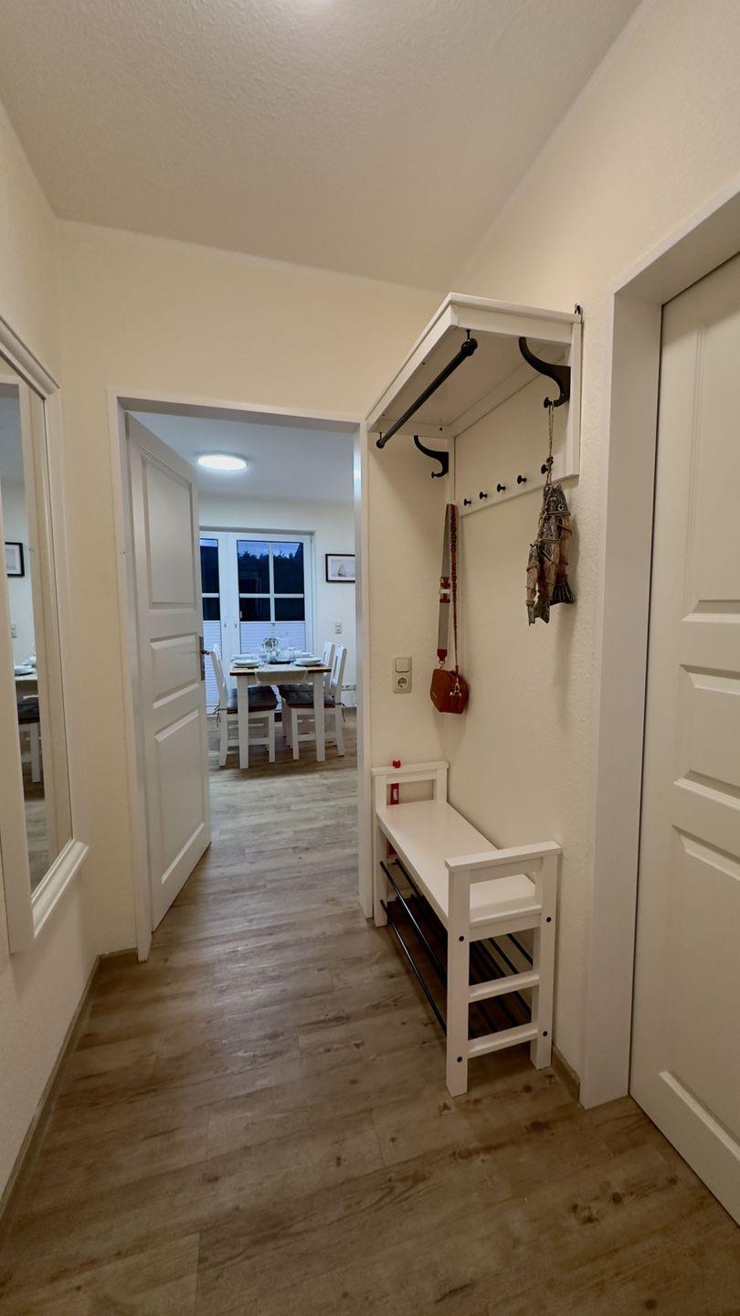 Beim Betreten der Wohnung empfängt Sie eine helle und freundliche Einrichtung im Landhausstil. Die warmen Erdtöne des Fußbodens schaffen eine gemütliche Atmosphäre, die Sie sofort entspannen lässt. Der Flur ist praktisch gestaltet: Eine Garderobe mit Sitzbank lädt zum Ankleiden ein, und ein großer Ganzkörperspiegel ermöglicht den letzten perfekten Blick vor dem Start in den Tag.