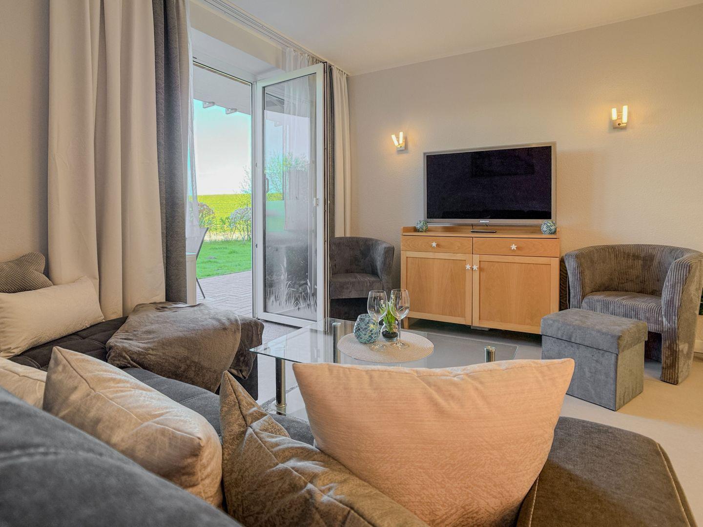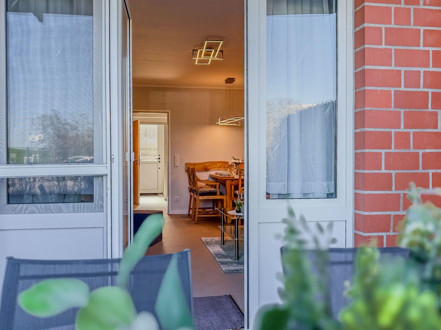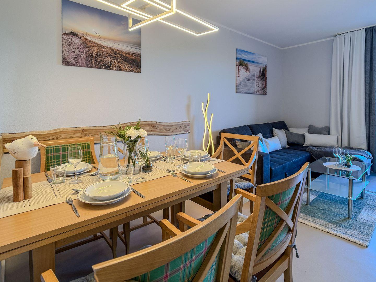 Mit direktem Zugang zur Terrasse und Blick zum Deich, zwei Schlafzimmern, neuer Küche und liebevoll eingerichtetem Wohnbereich lädt die Wohnung zu entspannten Familienmomenten ein – nur einen Spaziergang vom Strand entfernt.