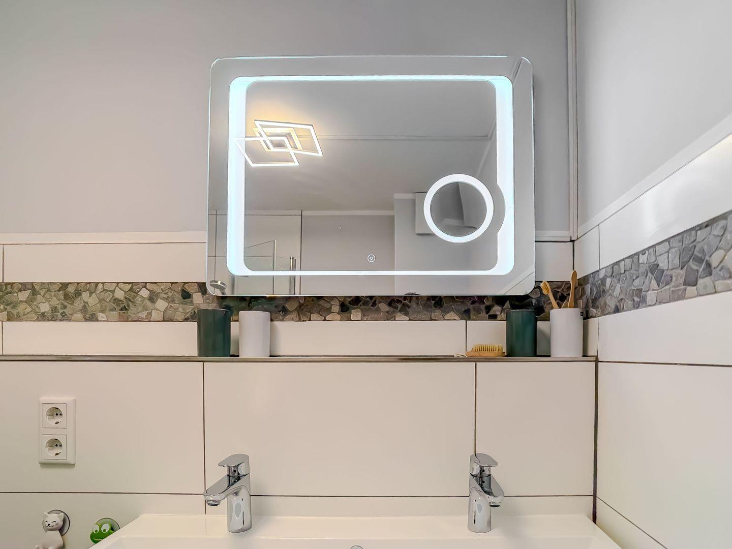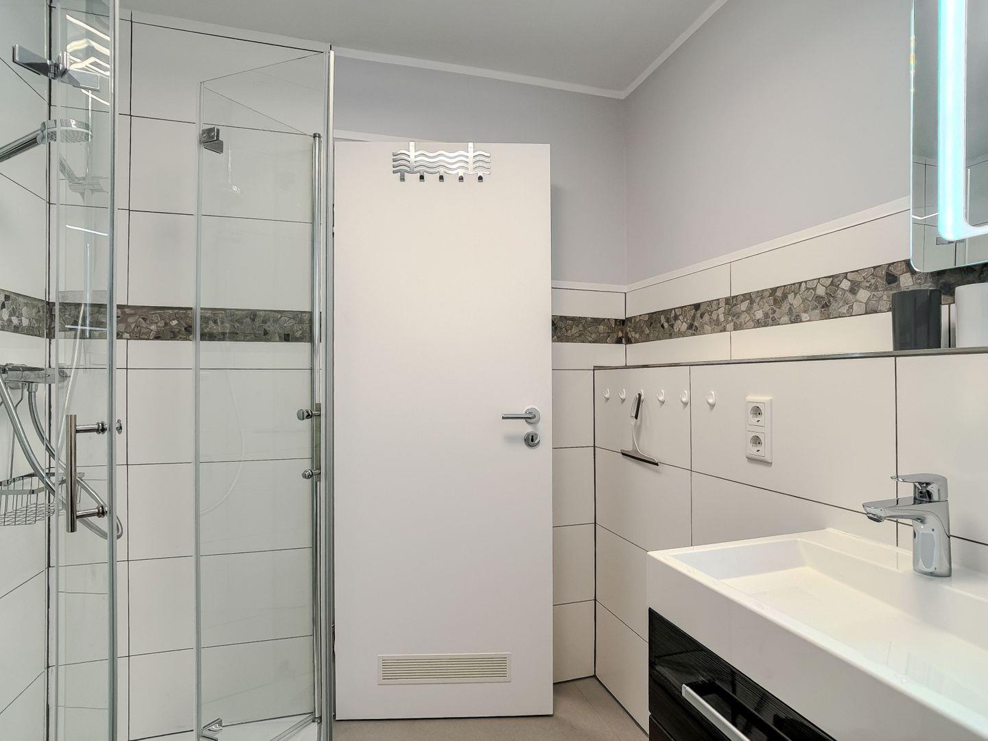 Das modern gestaltete Badezimmer ist hell gefliest und bietet ausreichend Platz für Ihre morgendliche Frische oder einen entspannten Start in den Abend.
