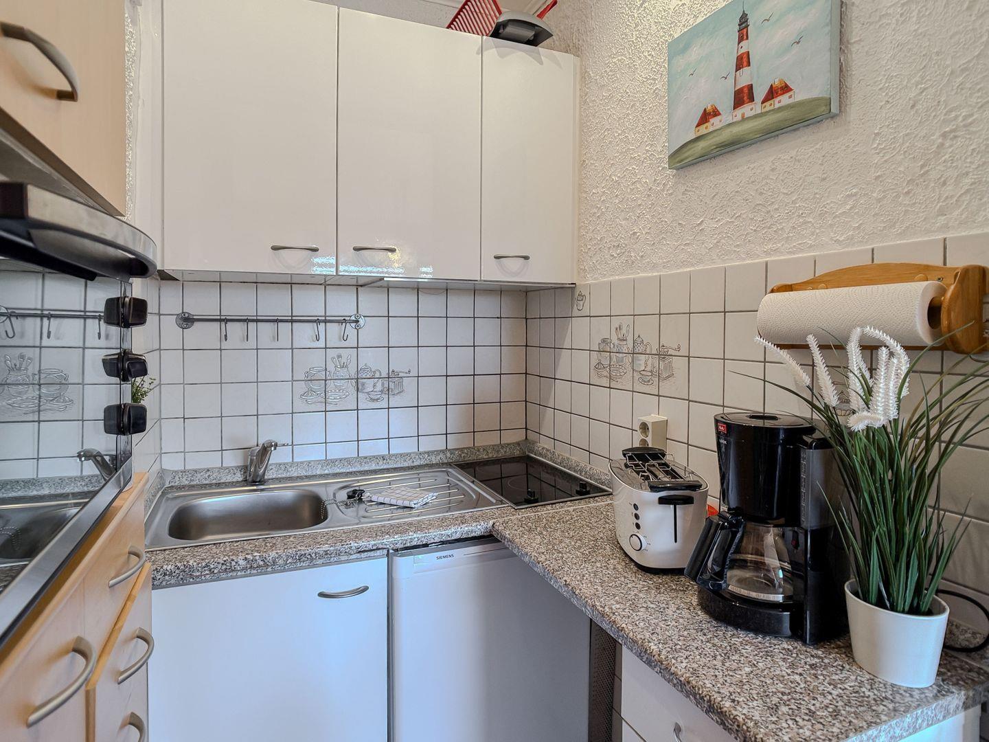 Direkt angrenzend lädt die liebevoll eingerichtete Essecke zu gemeinsamen Mahlzeiten ein, während die praktische Kochnische alles bereithält, was Sie für eine sorgenfreie Selbstversorgung benötigen.